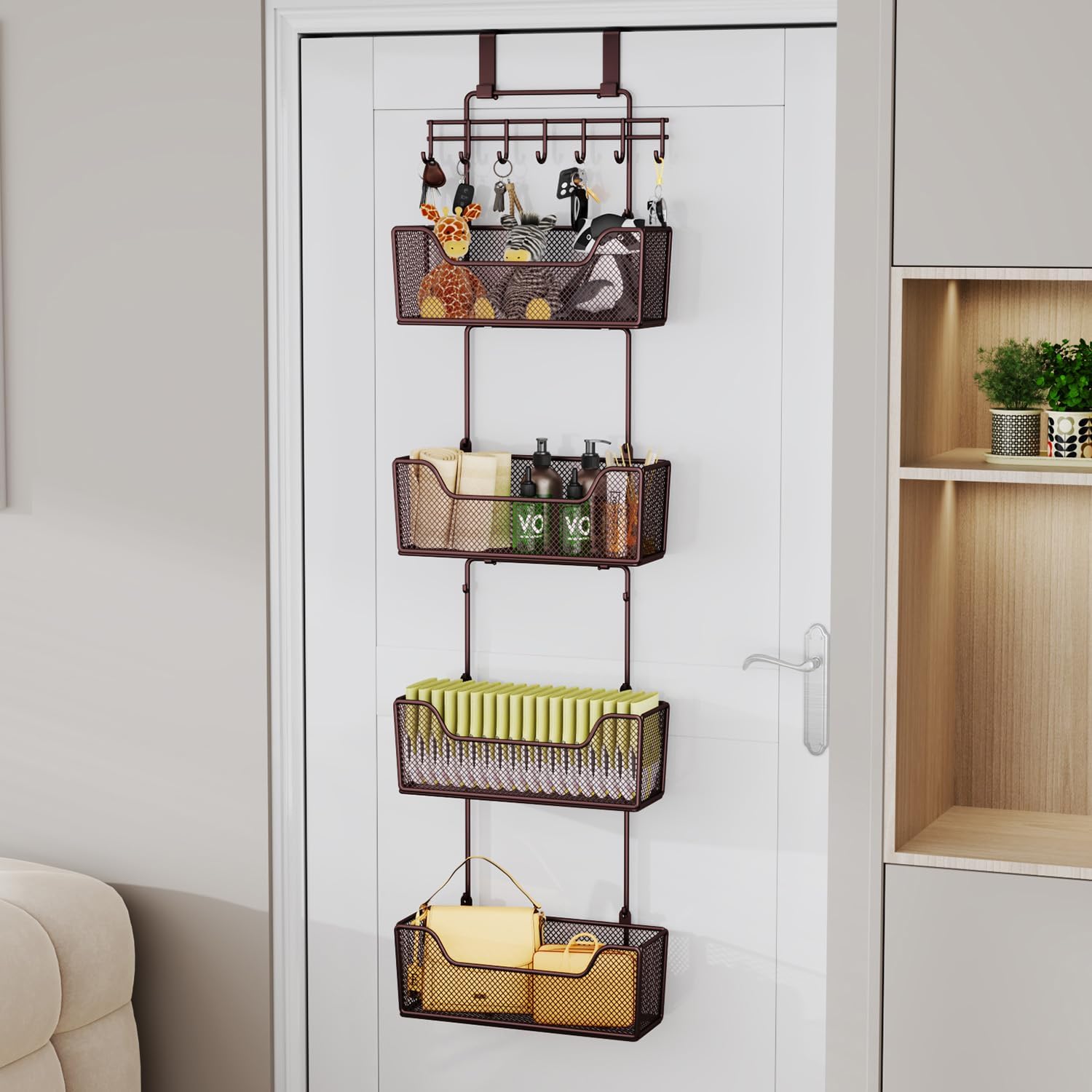 - [Super large capacity storage basket with hooks] Unlock the potential of your space with our over the door organizer. Our over the door storage has 4 large-capacity baskets that can effortlessly accommodate your essentials, and baskets are mesh-designed to hold smaller items at the same time! Neatly hang and store a variety of items, from towels to accessories, thanks to the convenient row of hooks. Say farewell to clutter and welcome a tidier, more efficient life with this over door organizer space-saving solution