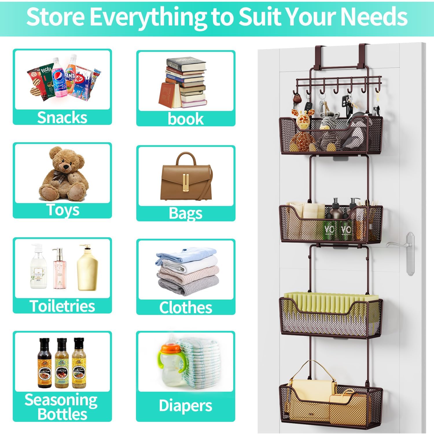 - [Multipurpose over door storage organizer] Whether it's in the kitchen, bathroom, bedroom, or any room, this door rack organizer's multifunctional design adapts to your needs. The back of the door organizer can store bathing products, cosmetics, towels, dolls, bags, baby products, snacks, bottles, spice bottles, within arm's reach