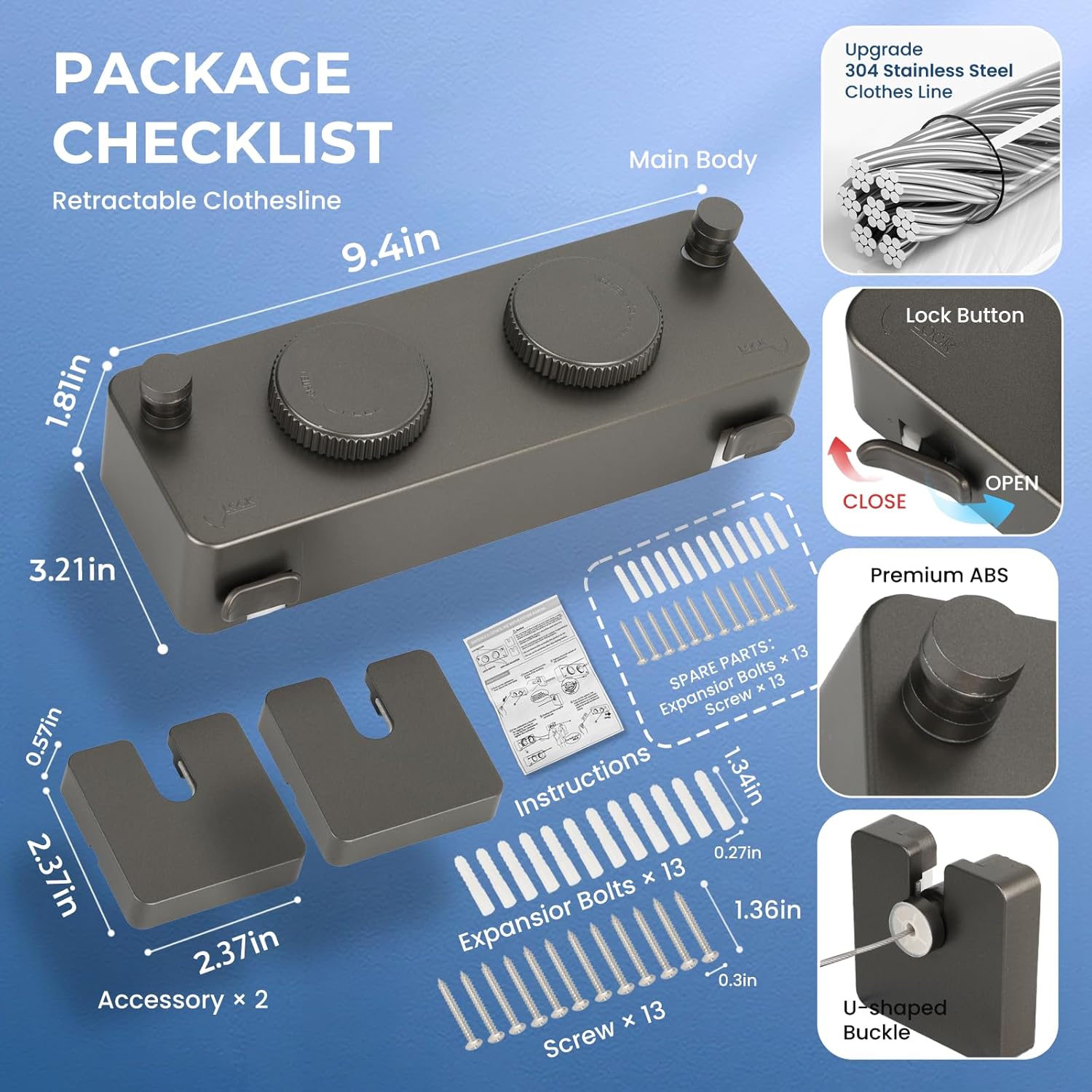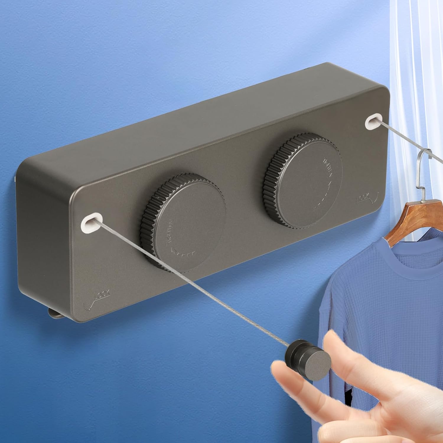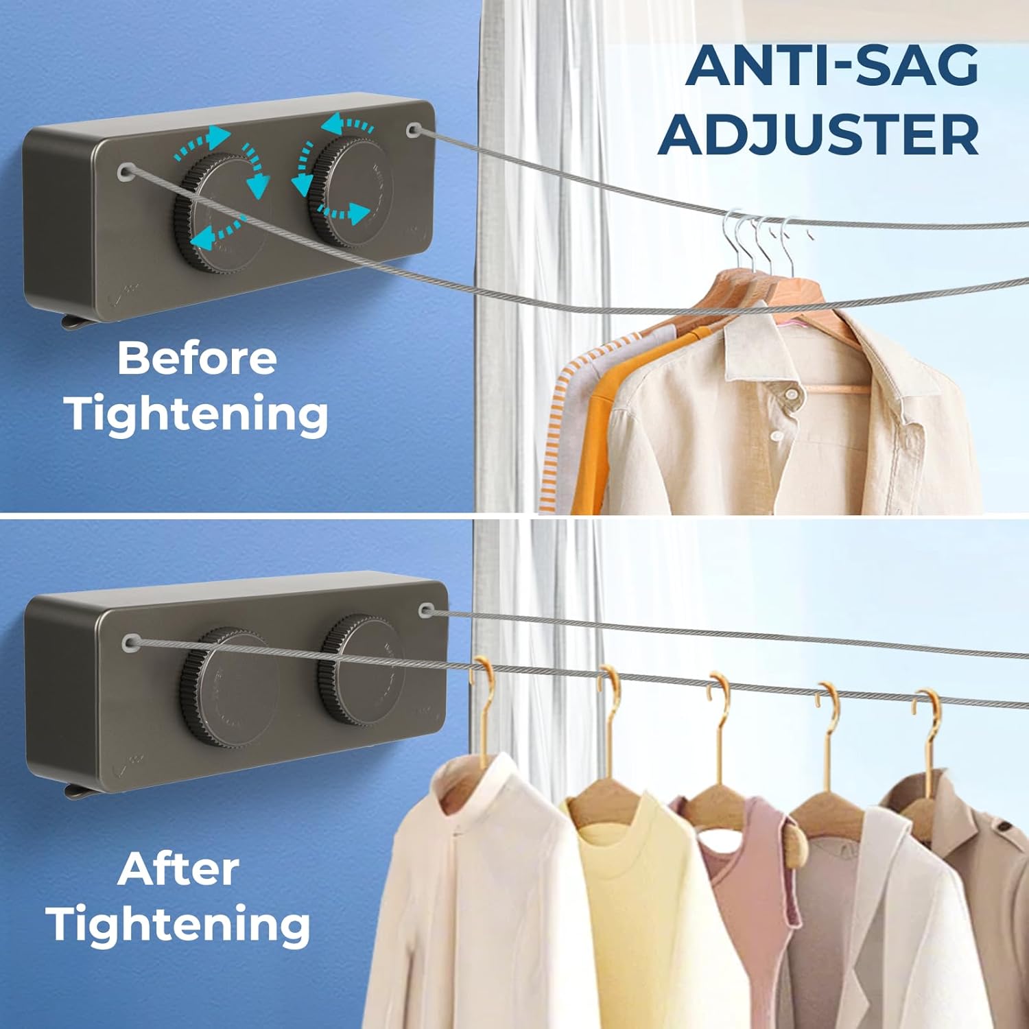 - 【Retractable Clothesline Indoor Outdoor Heavy-Duty】 Upgrade 304 Stainless Steel Clothes Line anti-sag design supports Single rope 40lb double rope use 70lb . Features a knob-locking mechanism for stable drying of heavy items like Outdoor Drying Rack Clothing blankets and jeans.