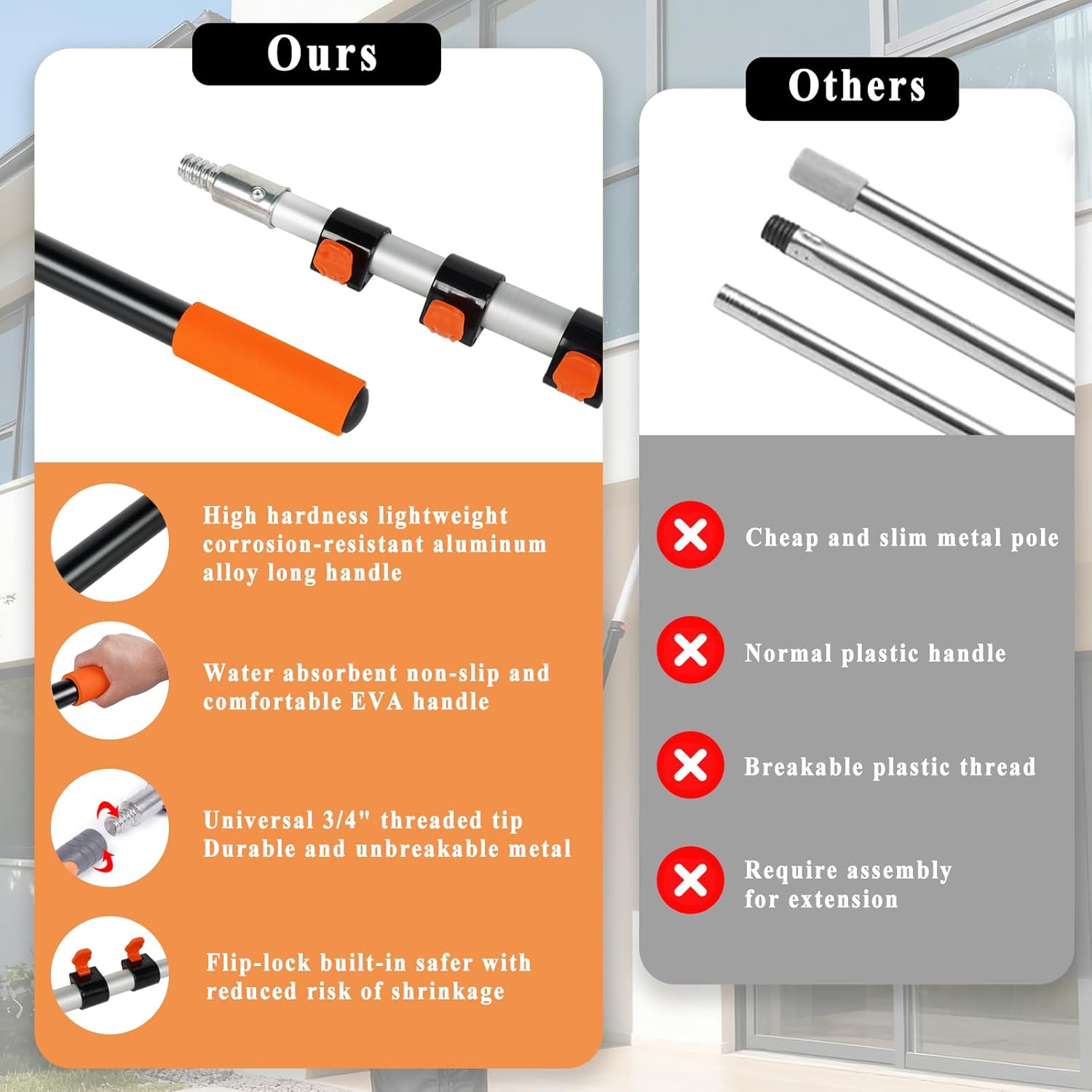 - Heavy-Duty Telescopic Extension Pole – Crafted from lightweight yet durable aluminum alloy, it stays rigid even when fully extended. The non-slip EVA foam handle provides comfort, while the flip-lock system lets you easily adjust the length from 5 ft to 12 ft without sliding. In handheld use, it reaches up to 20 ft high, allowing you to clean ceilings, corners, and other hard-to-reach spots safely