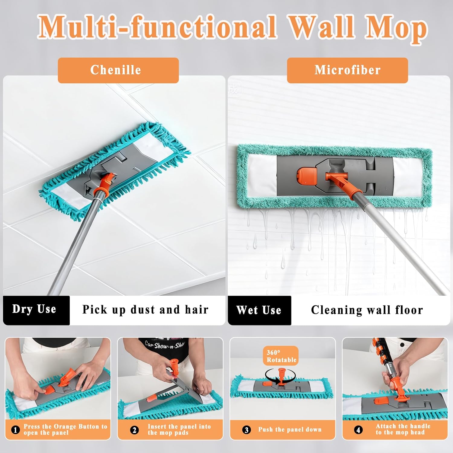 - 360° Rotating Head & Wet/Dry Wall Cleaner Mop – Features a flexible 360° rotating head that easily reaches corners, high walls, and ceilings for efficient cleaning. Includes 2 microfiber pads for deep wet cleaning, ideal for bathroom walls and windows, and 2 chenille pads for dry dusting to remove dust, dirt, and hair