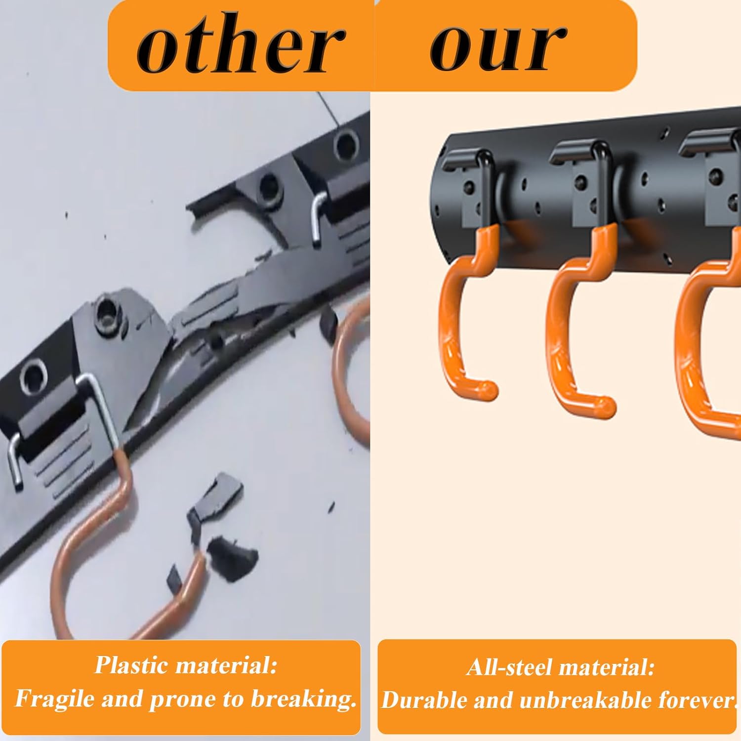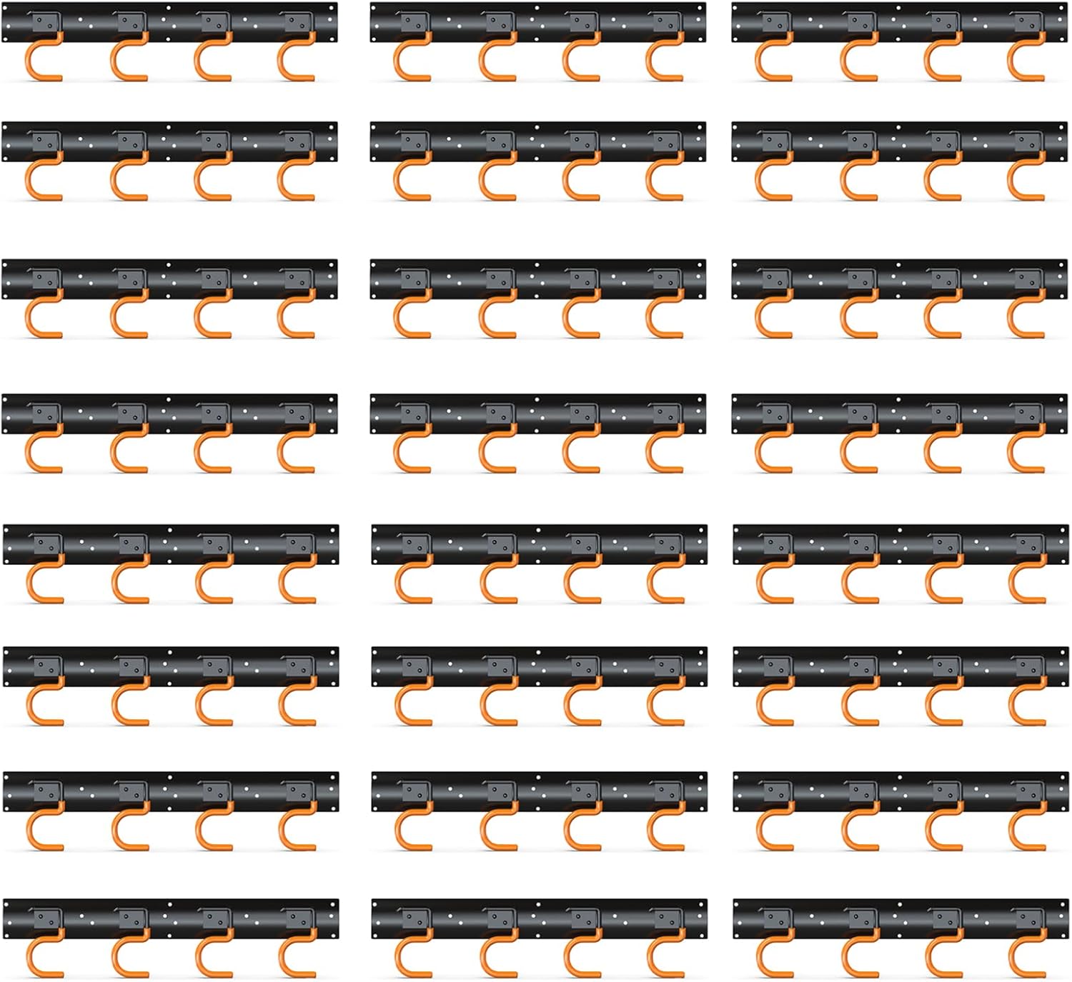 - Fully metal made: Our garage organizer wall mount back panel and hooks are all made of solid steel which makes the broom hanger wall mount is durable and sturdy. With more than 20 years' experience in mount, we have passed the professional load-bearing test, the maximum load of this broom organizer wall mount total is 120 lbs (each panel 60 lbs,each hook 15 lbs). The load-bearing capacity of the shed organizer far exceeds plastic made garage hooks and its service life is longer