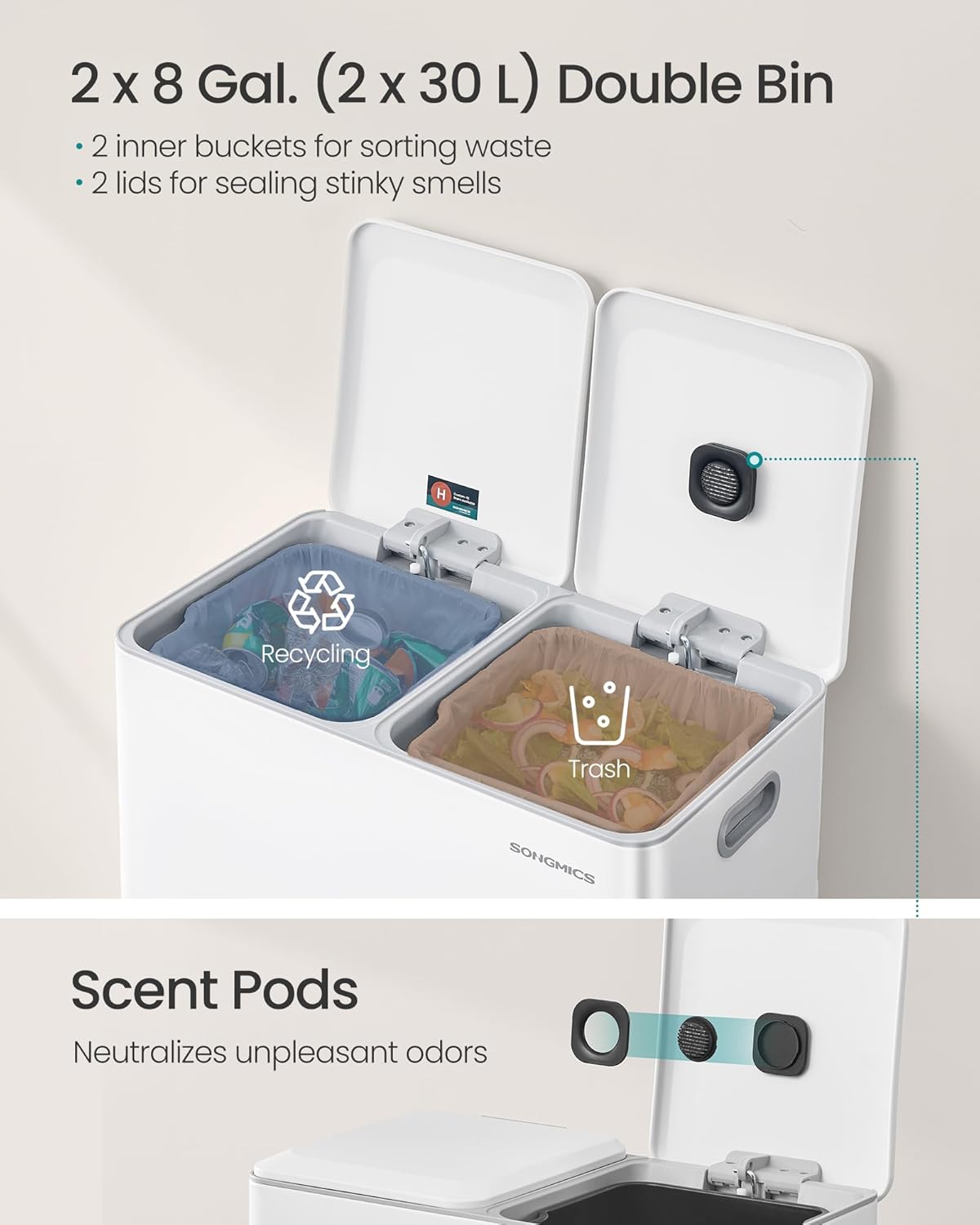 - Ready to Use: This double trash can includes 15 trash bags for immediate use and is compatible with SONGMICS 8-gallon trash bags (code H). The inner bucket features a bag hole to keep liners securely in place