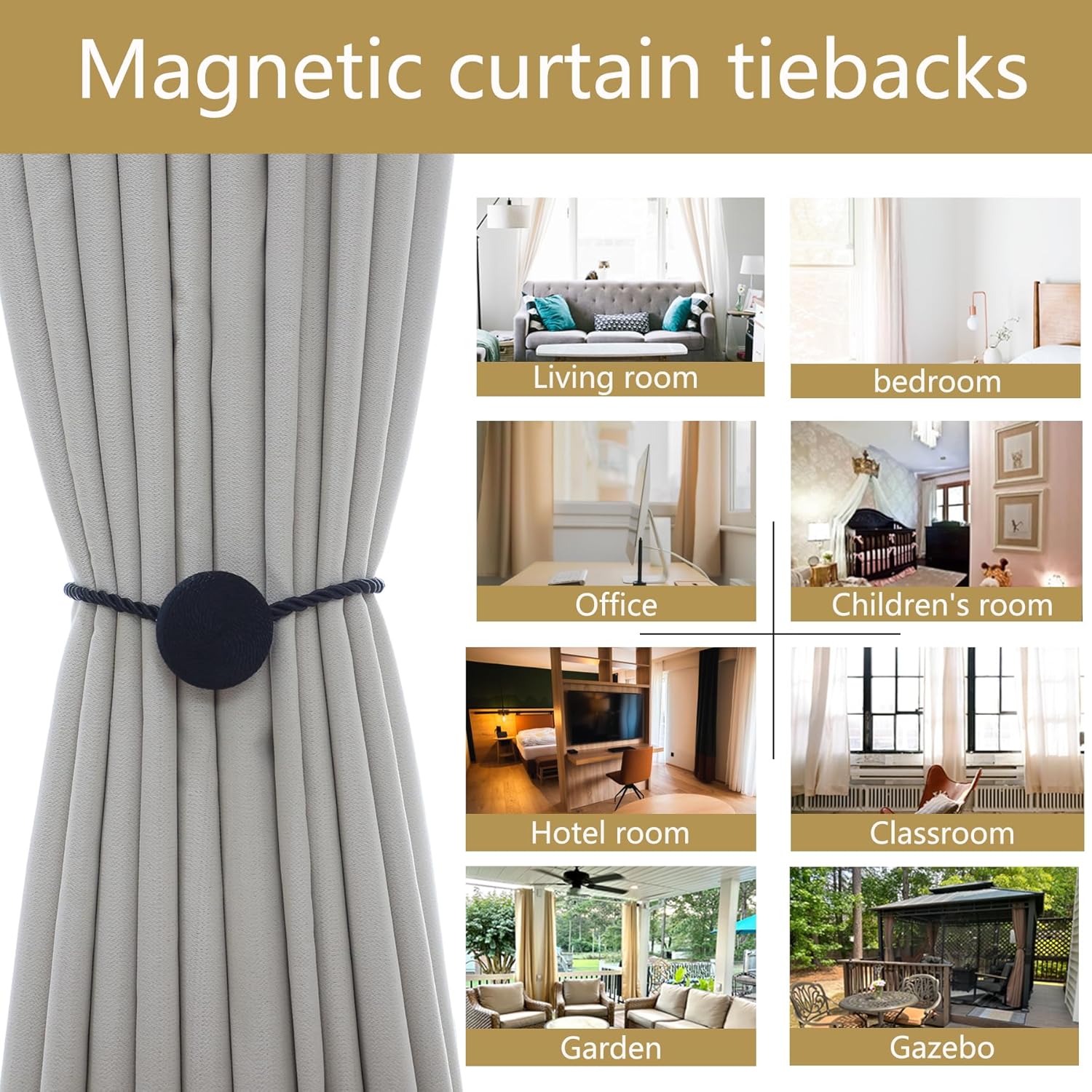 - 🎯 Versatile Styling Anywhere: Versatile for Any Room & Curtain: These magnetic curtain tiebacks perfect for thick blackout drapes or sheer curtains, used fully tied or half-tied. Perfect for living rooms, bedrooms, offices & bathrooms. European braided design blends with farmhouse, modern, or classic decor. Holds thickest curtains yet gentle on fabrics.