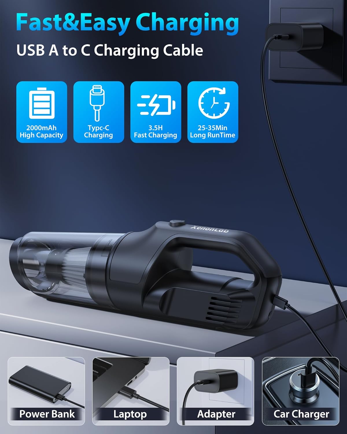 - Say Goodbye to Battery Anxiety : This dust buster cordless rechargeable uses a Type-C charging port, perfect for your car, office, or home. Powered by high-efficiency 2000mAh batteries, this hand vacuum cordless rechargeable hand vacuum runs for up to 25 minutes. Whether it’s a quick cleanup in the car or daily use around the house, it's a reliable mini vacuum cleaner cordless option.