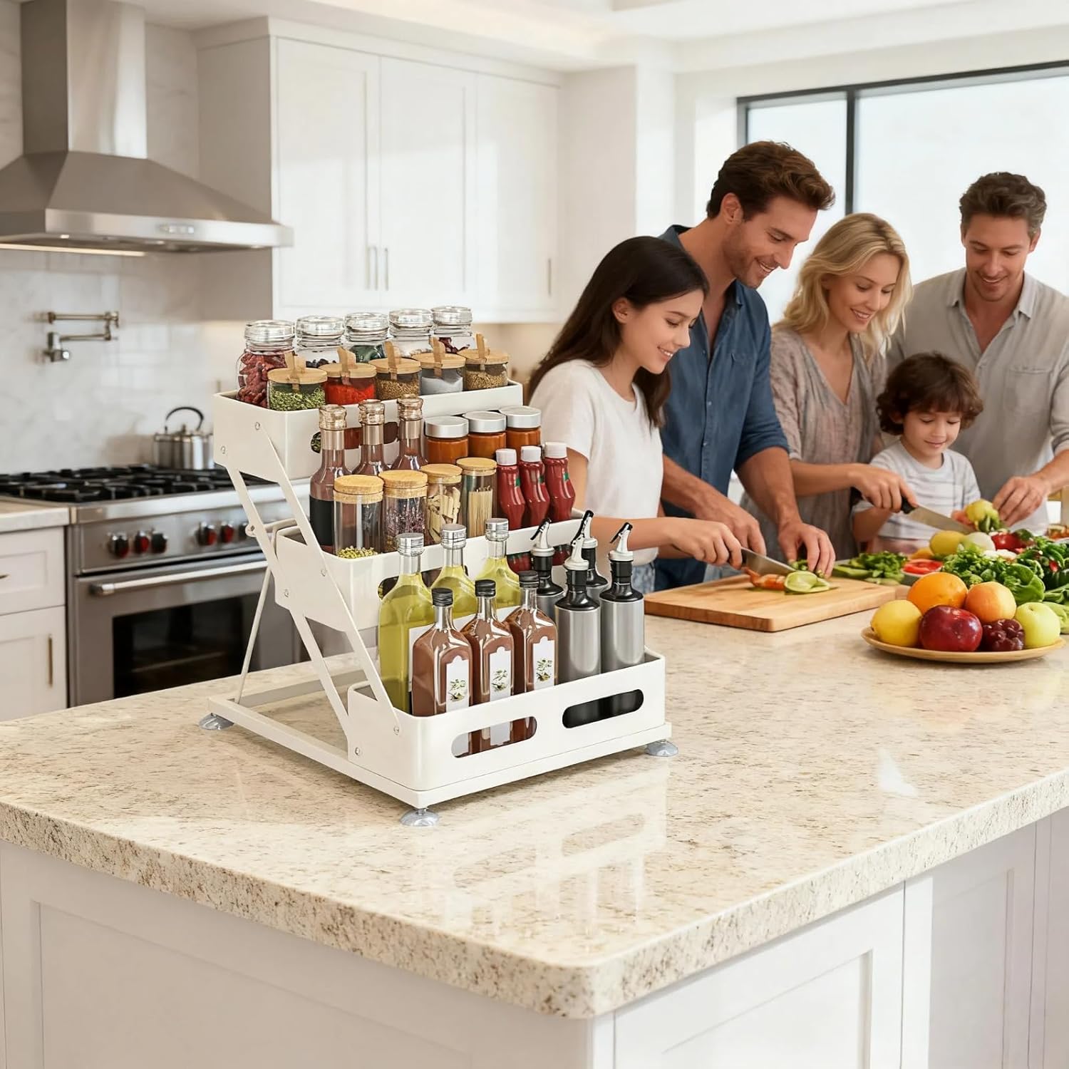 - Unique Design -- Compared to other spice racks, our spice rack for countertop features 3 flat-bottomed storage baskets. This design provides greater weight capacity while preventing items from tipping over or falling out.