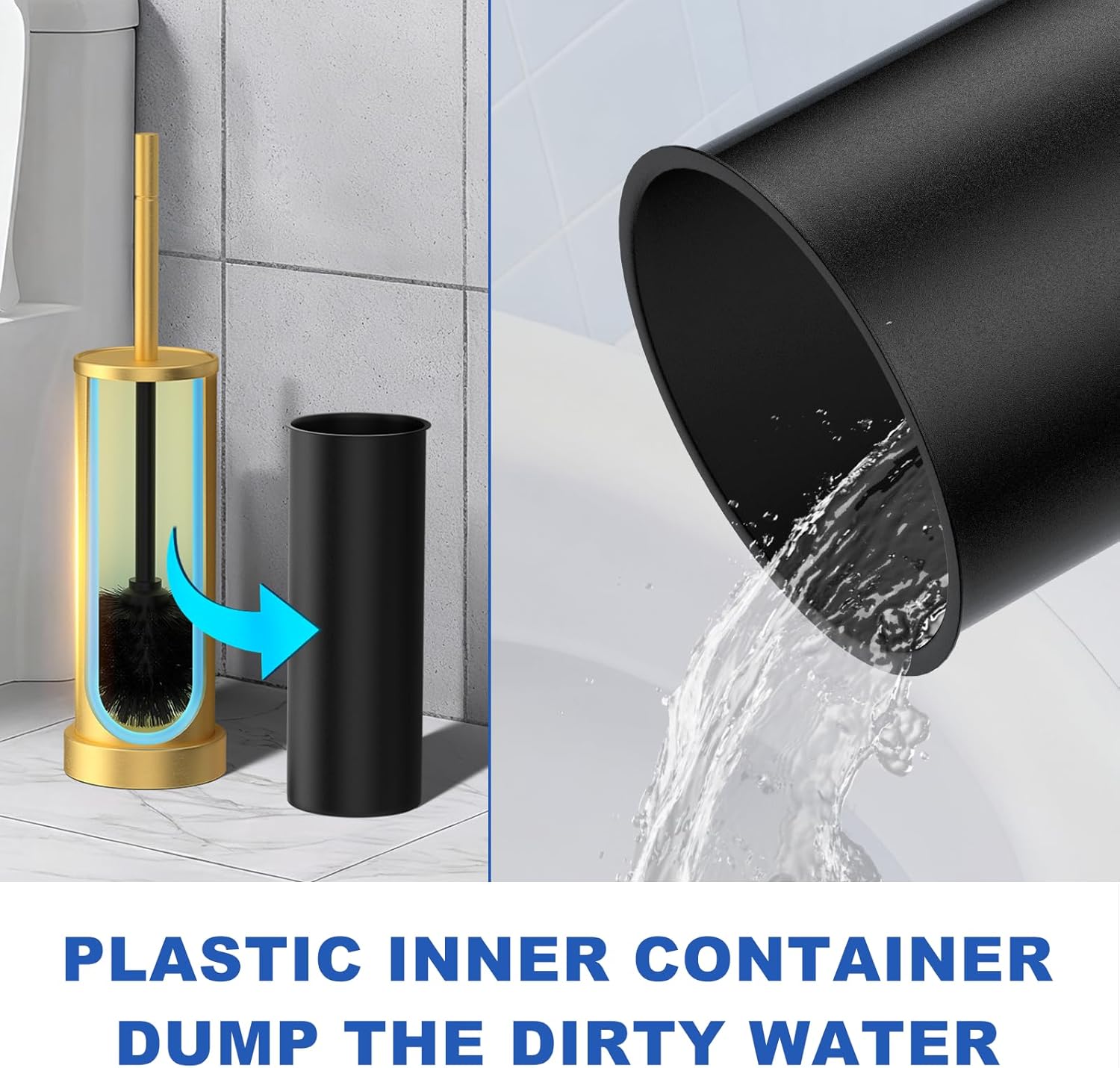 - Detachable Inner Tube & Heavy Duty Base: Stay safe and hygienic! The freestanding toilet brush holder has a weighted base to prevent tipping. Independent inner barrel design allows quick pouring of accumulated water—no more odors. The toilet brush holder comes with a protective sponge at the bottom to avoid scratching your floor when moving