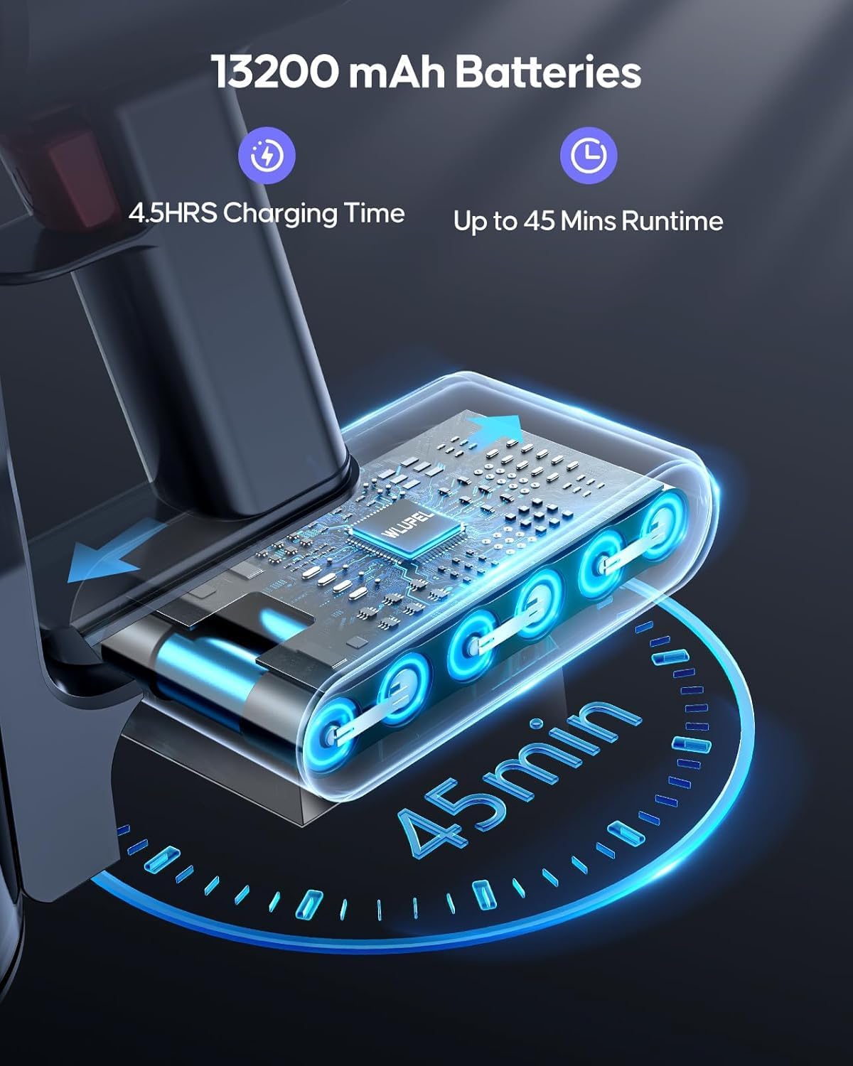 - [45-Minute Battery Life] This cordless vacuum cleaner equipped with a 13,200mAh battery, boasts up to 45 minutes of battery life in low speed mode and up to 20 minutes in high speed mode, allowing it to clean an entire room on a single charge. Easing your battery life worries for cleaning home.