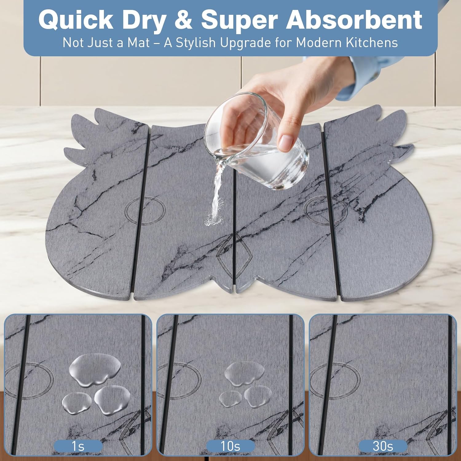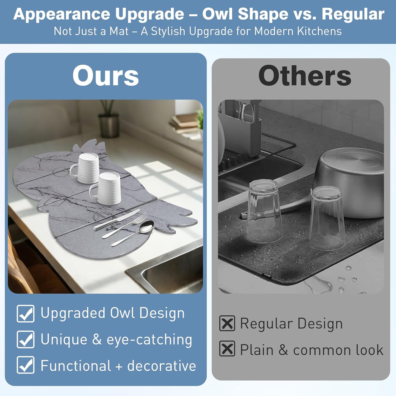 - 【Upgraded Owl Design with Elegant Marble Pattern】Stylish owl-shaped stone dish drying mat with a marble pattern adds a decorative and modern touch. Perfect upgrade for kitchens seeking both functionality and aesthetic appeal