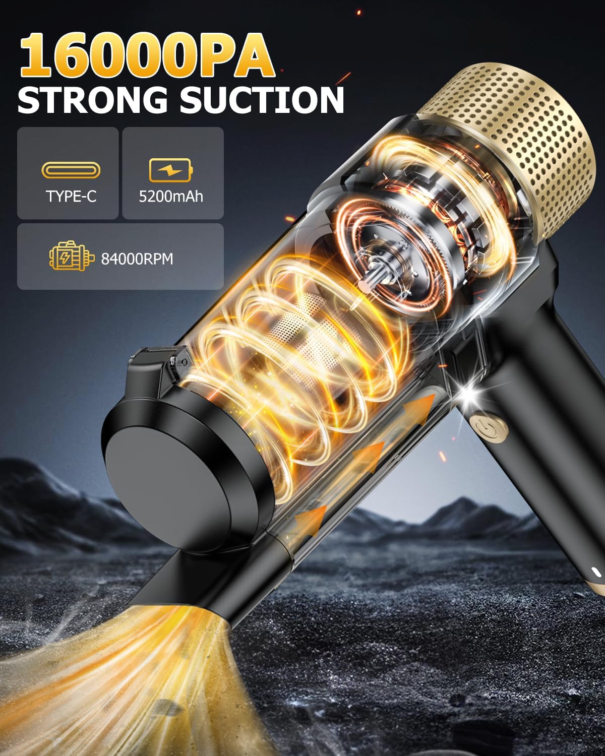 - 🔋【Fast & Safe Type-C Charging】This handheld vacuum cordless is equipped with a 5200mAh battery and Type-C interface. Charging is safe and efficient, taking 3 hours to full charge, and it supports 30 minutes of continuous use when fully charged. The indicator light shows red while charging and green when fully charged, allowing you to keep track of its charging status in real time. Additionally, it can be easily recharged via a car charger, power bank, making it more convenient to use