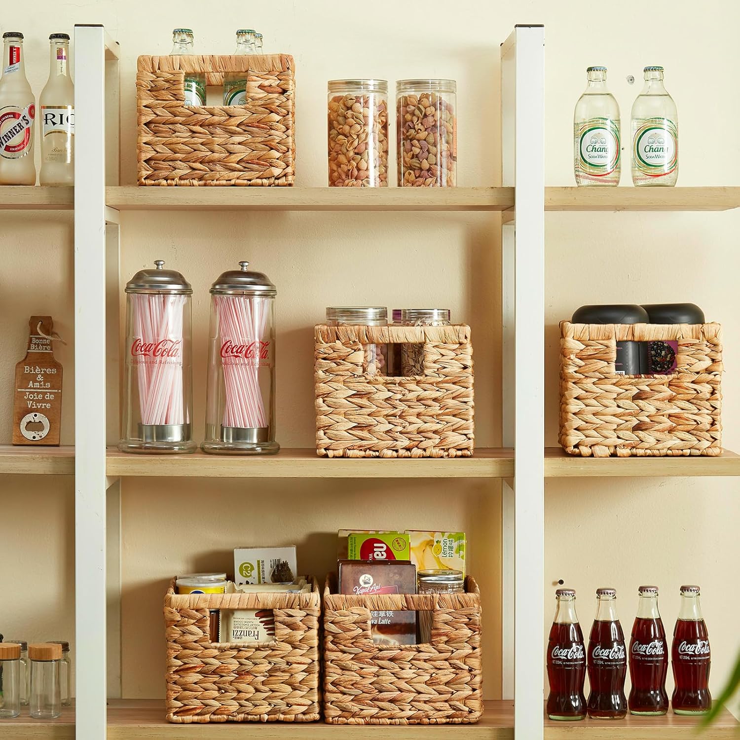 - ‎Chic Basket Design: With natural materials design, this water hyacinth basket with built-in handles complements any home decor style. Shelf baskets' earthy tones and organic texture add a touch of warmth and charm to your living space, while its practical shape make it a functional addition to any room.