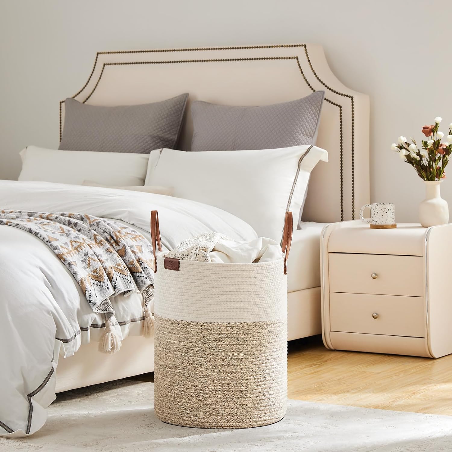VIPOSCO Tall Laundry Basket, Large Dirty Clothes Hamper with Leather Handle, Woven Rope Storage Basket for Blanket, Toy In Living Room, Bathroom, Bedroom - 53L White & Brown
