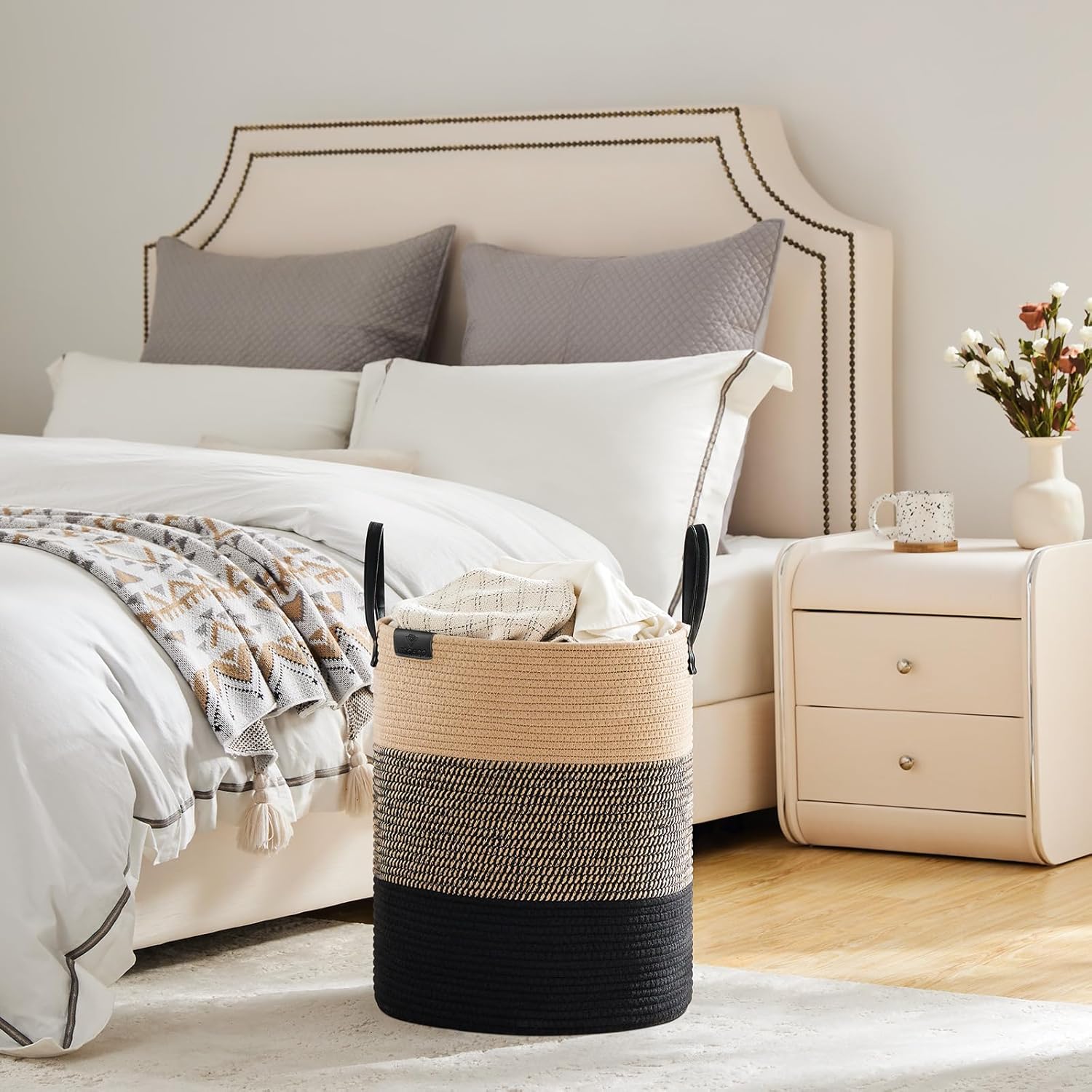 - ❤【MINIMALIST DECORATIVE BASKET】 This cotton rope woven basket with simple color splicing, leather handles and label can match different kinds of rooms, like living room, bathroom, bedroom, dorm, laundry room and nursery room. The round basket is also a fantastic gift idea for housewarming, baby showers, Valentine's Day and any other occasions.