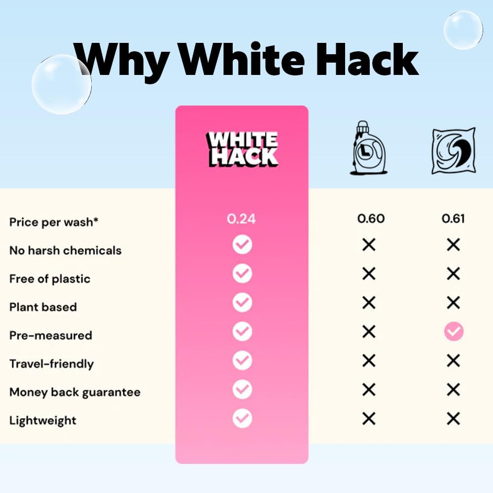 - LOW-FOOTPRINT, HIGH-PERFORMANCE: Small package, big results. From home to travel, White Hack makes laundry feel less like a chore – and more like a clean break from the old way of doing things. Travel laundry detergent sheets are so easy to use.