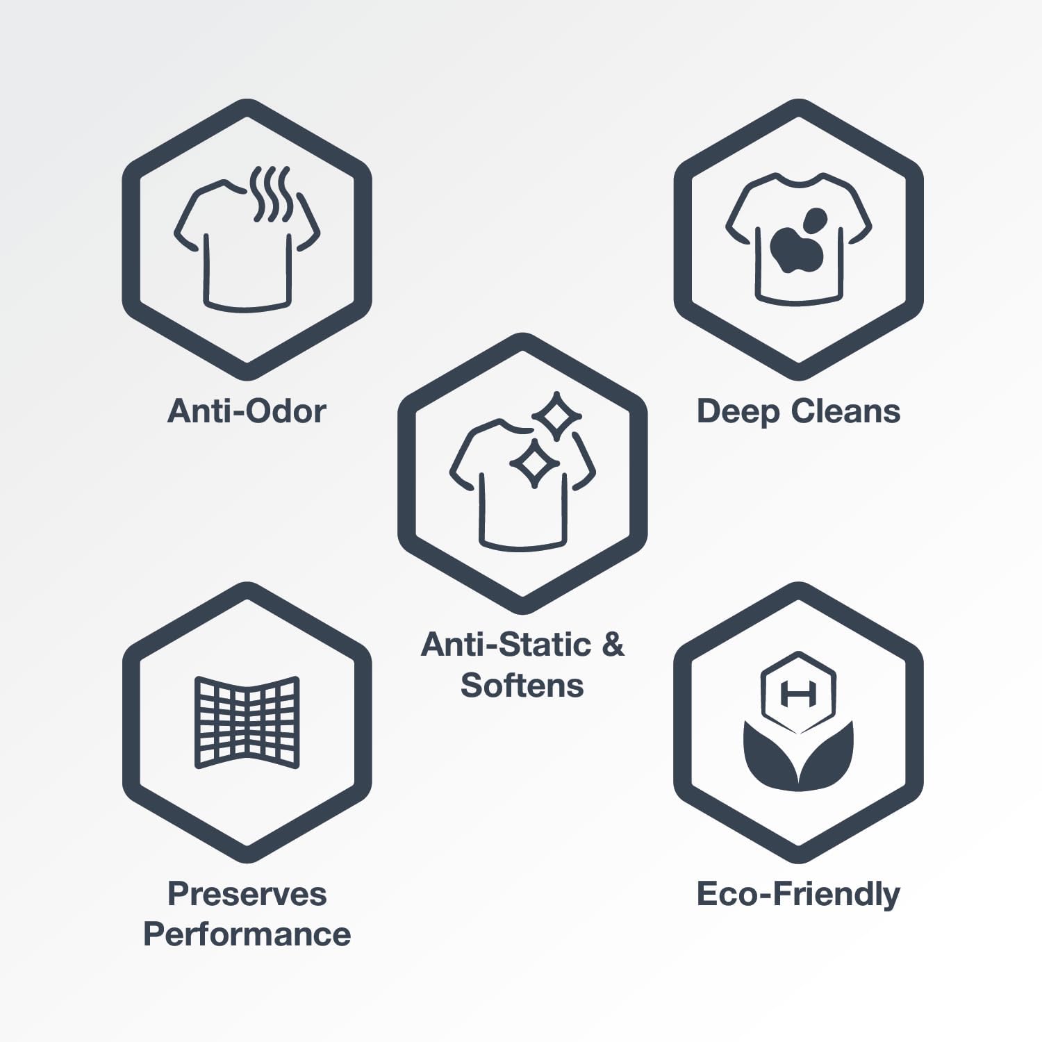 - POWERFUL FORMULA: Traditional laundry soap leaves leftover residue behind that corrode and clog your high-performance gear leaving them smelly and reducing their wickability. HEX Performance liquid active wear laundry detergent penetrates today’s ultra tight-knit performance fabrics, like your favorite yoga tops, leggings, sport bras, or compression shorts.