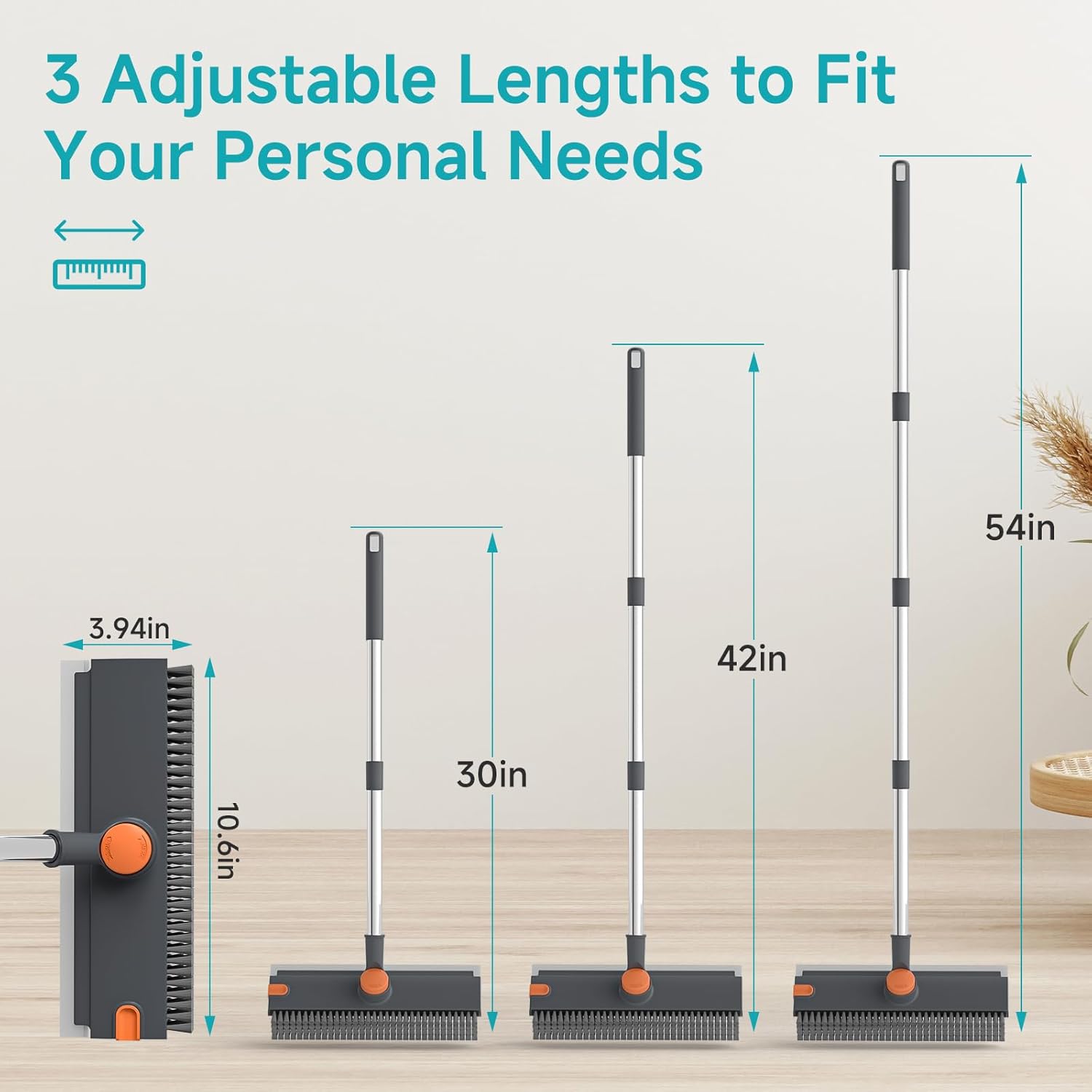 - 【Durable Materials for Wet/Dry Use】The PVC bristles are tough enough to handle regular use but gentle on tile, hardwood, and concrete floors; the stainless steel pole won’t rust, even when used in damp bathrooms, and the silicone scraper stays flexible to leave floors streak-free. Easy to clean and hang after use.