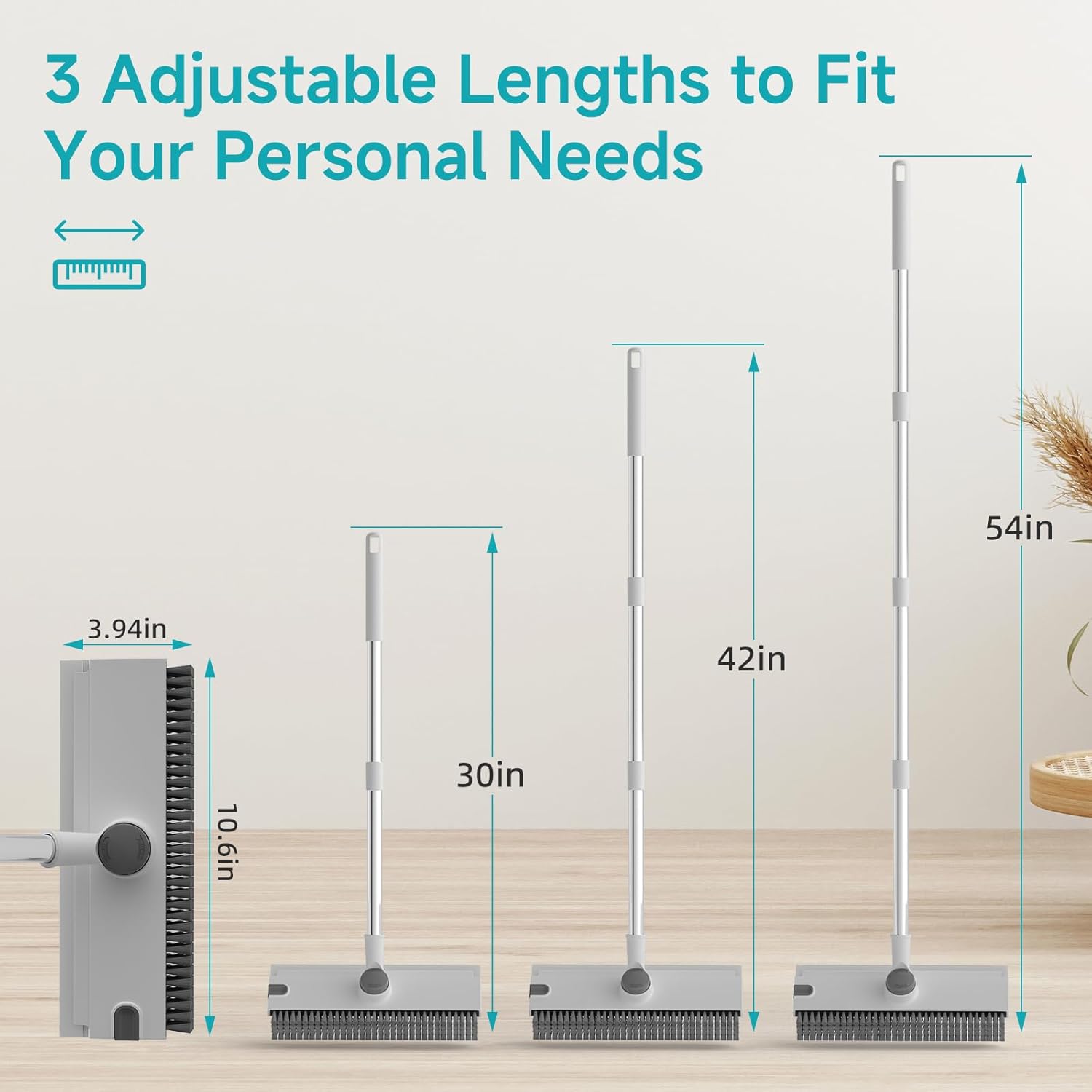 - 【3 Adjustable Lengths Scrubber Brush】Customize three height level adjustments at 30" - 42” - 54", you could choose the number of the part you assemble, for floor, shower glasses, walls cleaning at ease, say goodbye to unnecessary bending, and the stainless steel pole can last longer.
