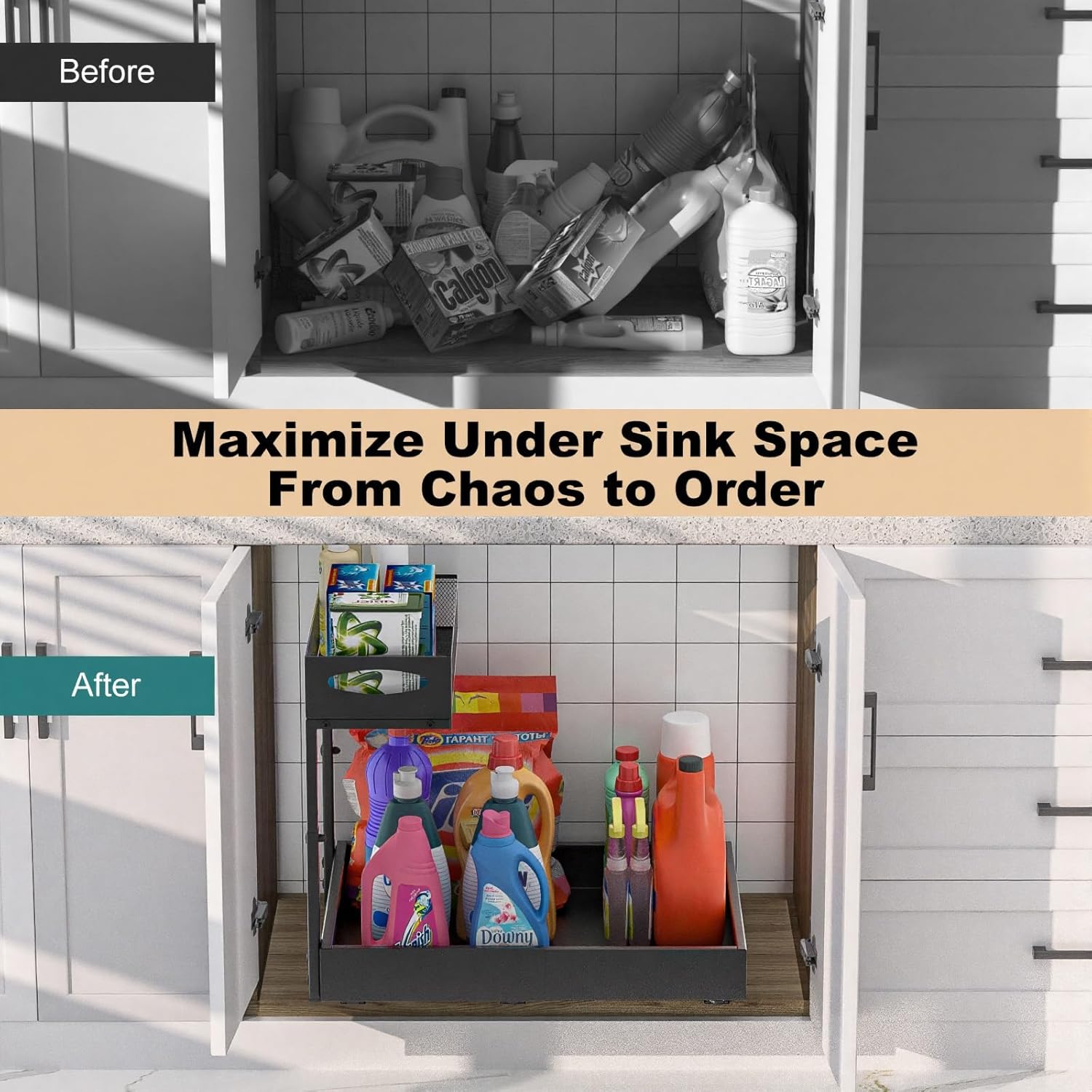 - Maximize Under Sink Storage: This under sink organizer features a 2-tier structure, transforming cluttered cabinet space into a neat and efficient storage area. The under cabinet organizer helps you make the most of every inch under the sink by keeping pots, pans, and cleaning supplies organized and easy to access
