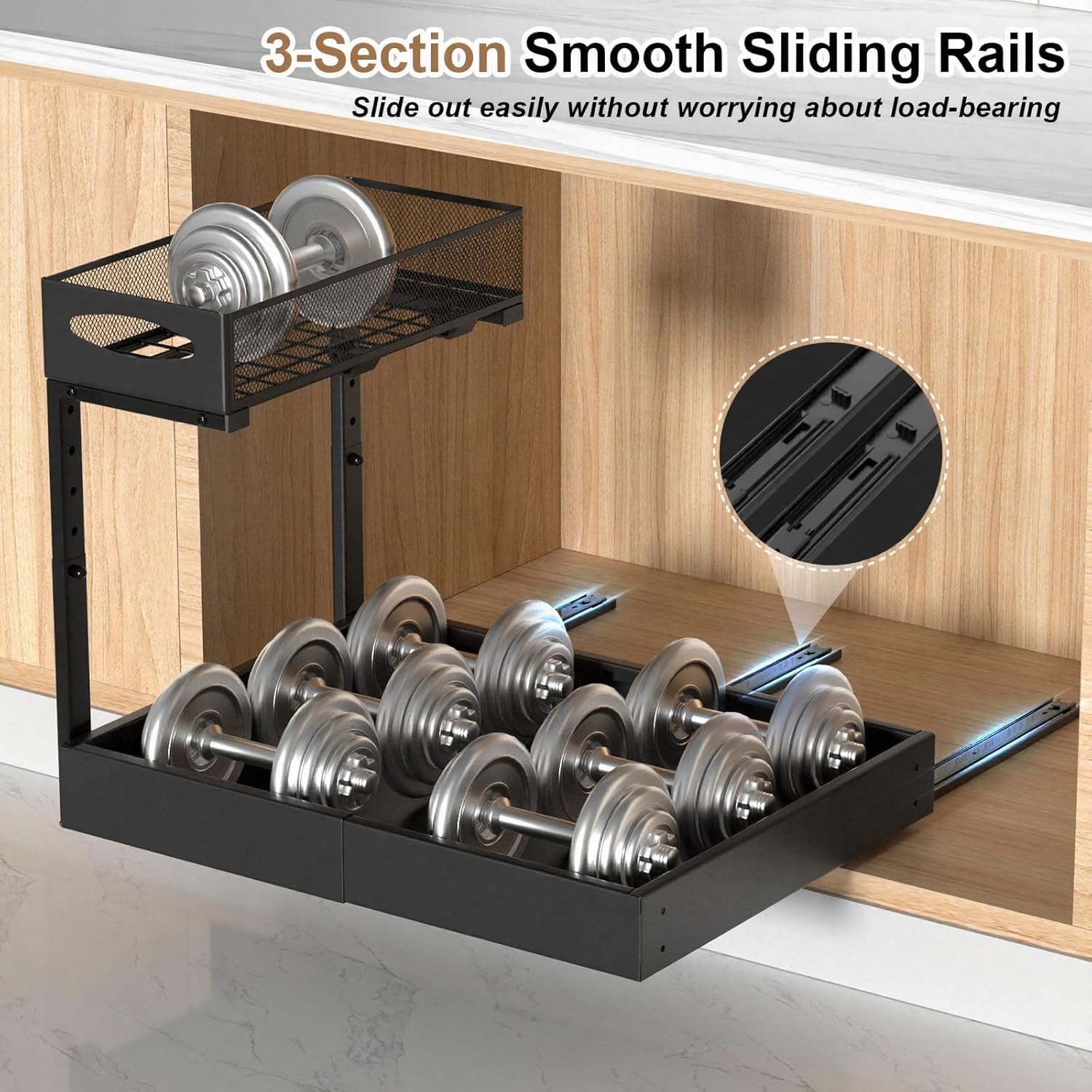 - Pull-Out Basket & Slide Track: The bottom basket features a retractable drawer design expanding from 13.8 inches to 20.7 inches. You can freely set the required width according to the bottom space. Equipped with 3-section smooth glide rails, it slides out fully with a gentle pull, letting you access items at the back without bending