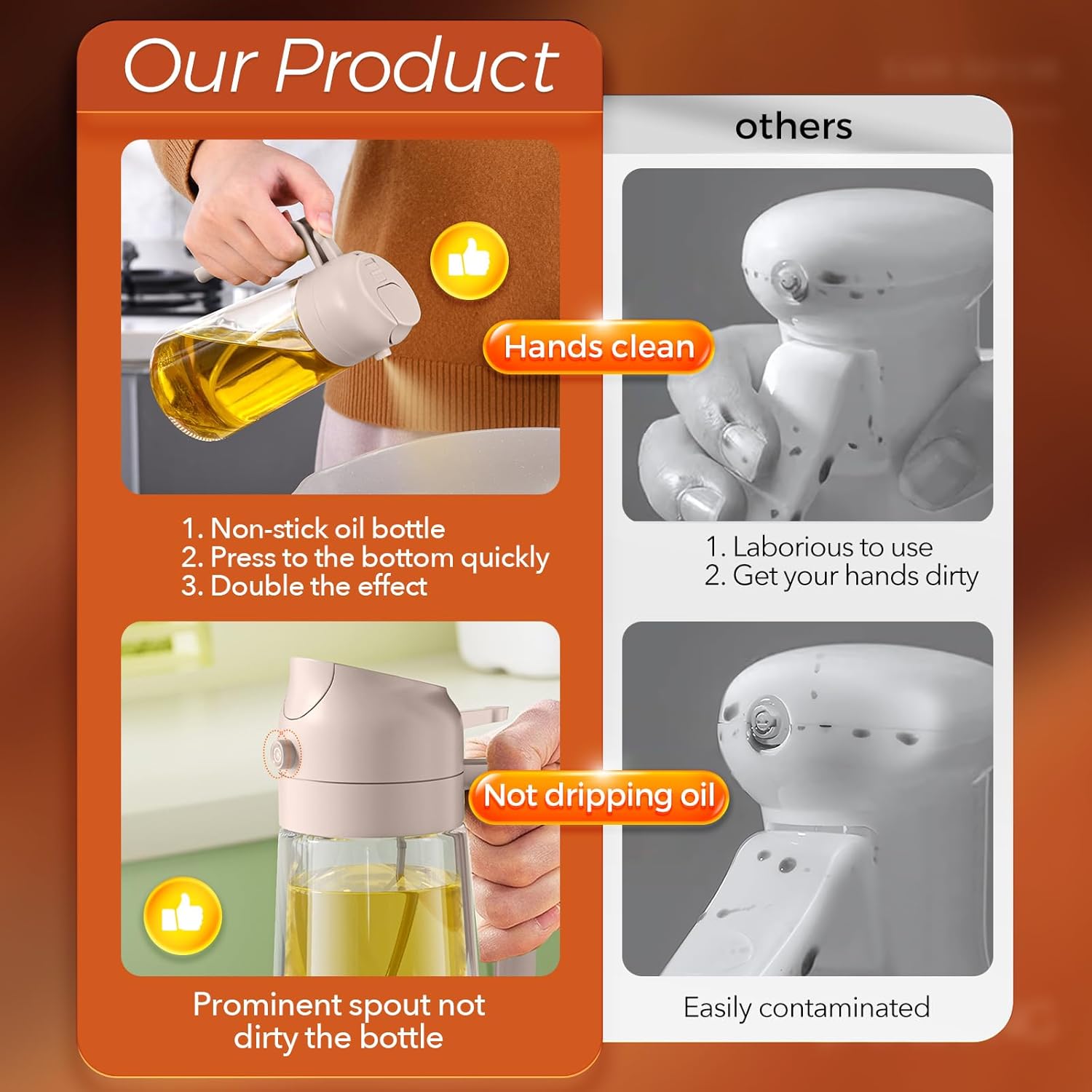 - Dual-Function Design & Multi-Purpose: Oil spray bottle for cooking offers the convenience of both spraying and pouring oil, suitable for a wide range of food preparation processes such as salad dressing, griddle, roasting, grilling, make your kitchen efficient and organized