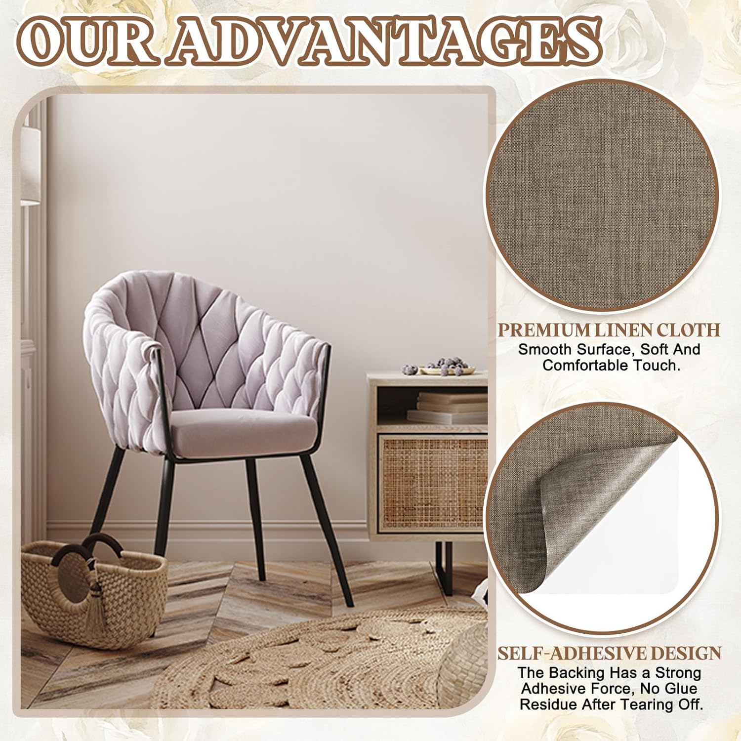 - Application: This self-adhesive linen patch is very suitable for various home and car scenes, such as repairing furniture such as sofas, tables and chairs, clothes, backpacks, handbags, car seats, etc. It can be used for various home crafts and decorations, and can also be used for outdoor tents, sails, hammocks, sleeping bags, outdoor furniture covers, luggage bags, etc
