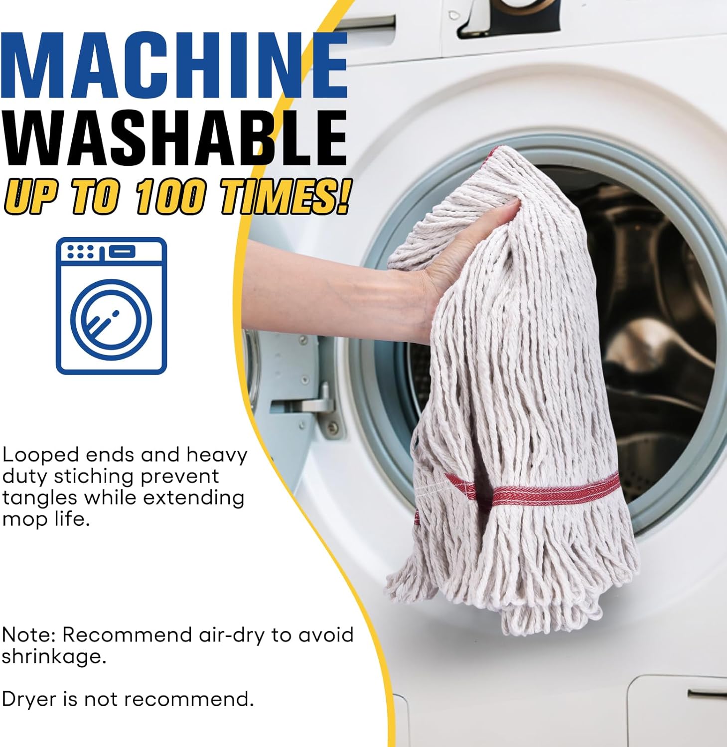- Washable and Long-Lasting: Commercial mop heads are launderable for extended long-term usage. Long-lasting fibers allow the mop head to be washed many times giving it a longer service life. This washable mop head is launderable up to 100 times! NOTE: Do not use dryer after laundering to avoid shrinkage and loosen string, air-drying is recommended.