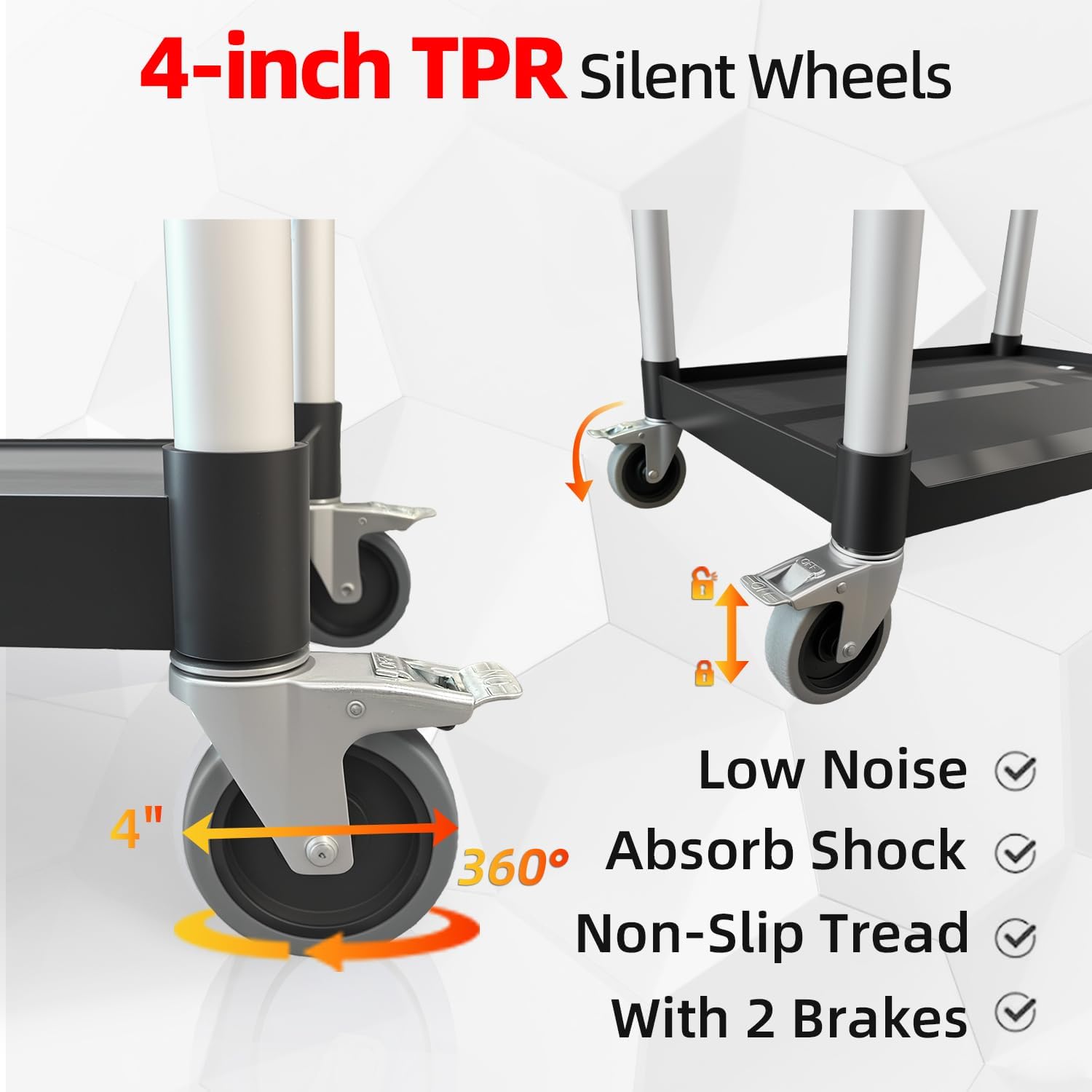 - Quiet & Stable Mobility: Engineered with four 4" high-resilience TPR casters that absorb vibration and roll quietly, protecting your items. Two locking wheels provide secure stability when needed. The flat front between trays allows you to slide items on and off the cart easily.
