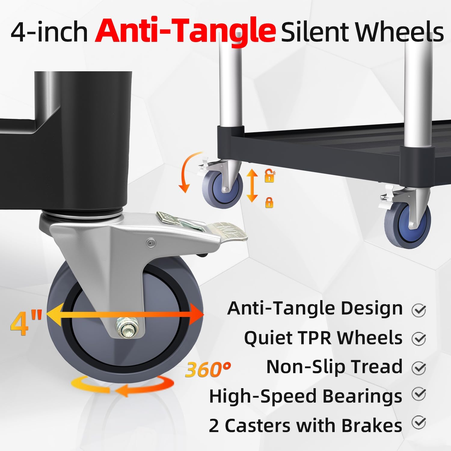 - Effortless & Silent Mobility : Equipped with four TPR anti-tangle casters that absorb vibrations and protect contents. Fully sealed bearings reduce friction and noise for smooth transport. Two lockable wheels provide stationary stability when needed.