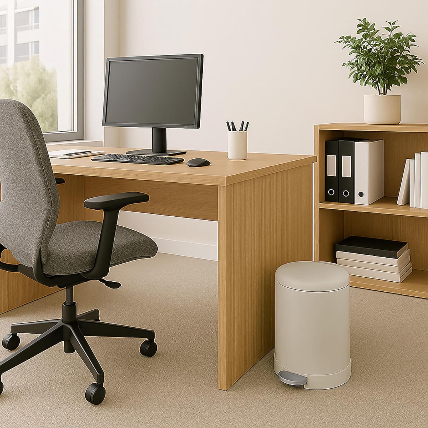 - SMALL TRASH CAN WITH LID - The 1.2-gallon capacity makes this compact trash can the perfect size for rooms with limited space. Makes a great office trash can for near desk, lidded bathroom wastebasket, and tiny step can for apartment kitchens.