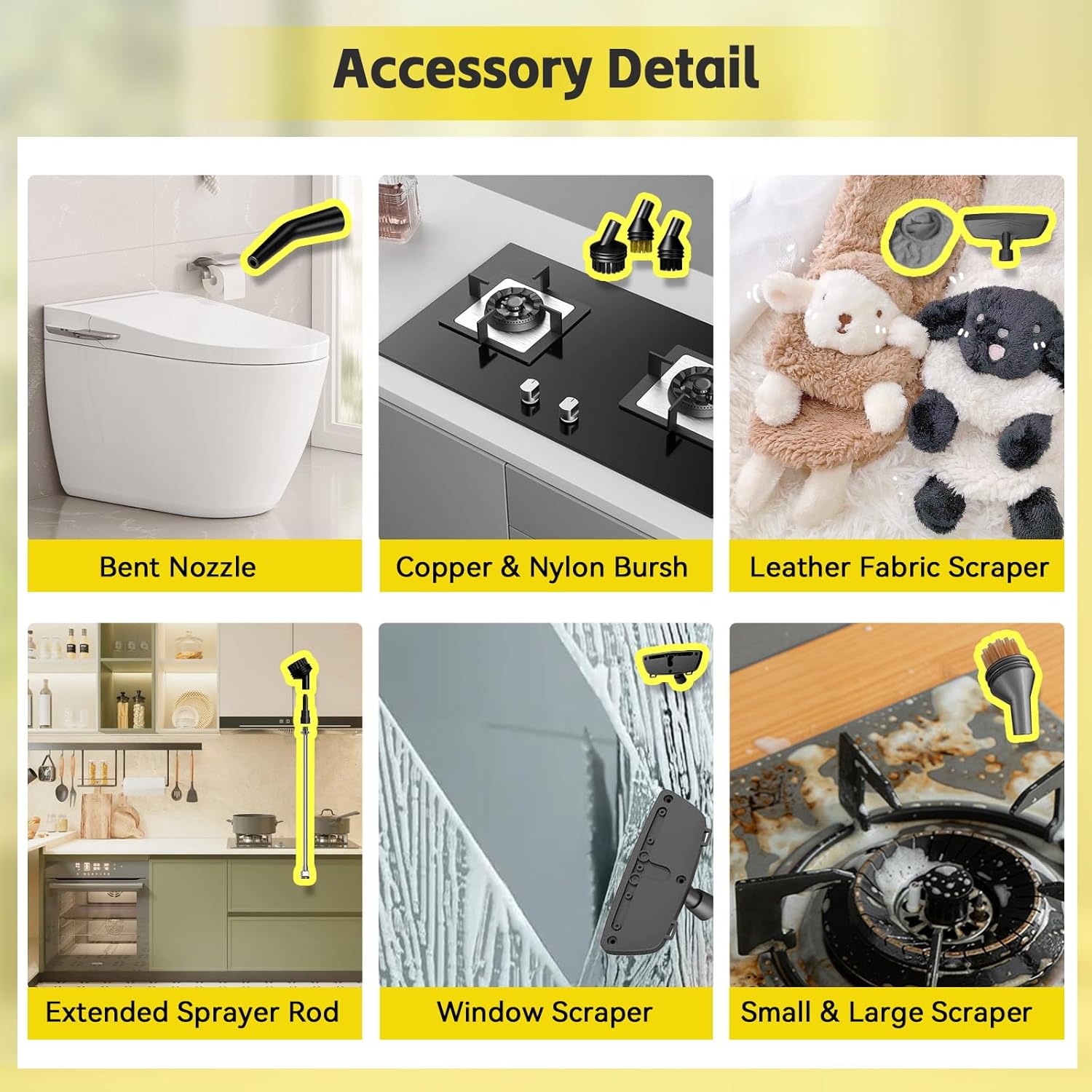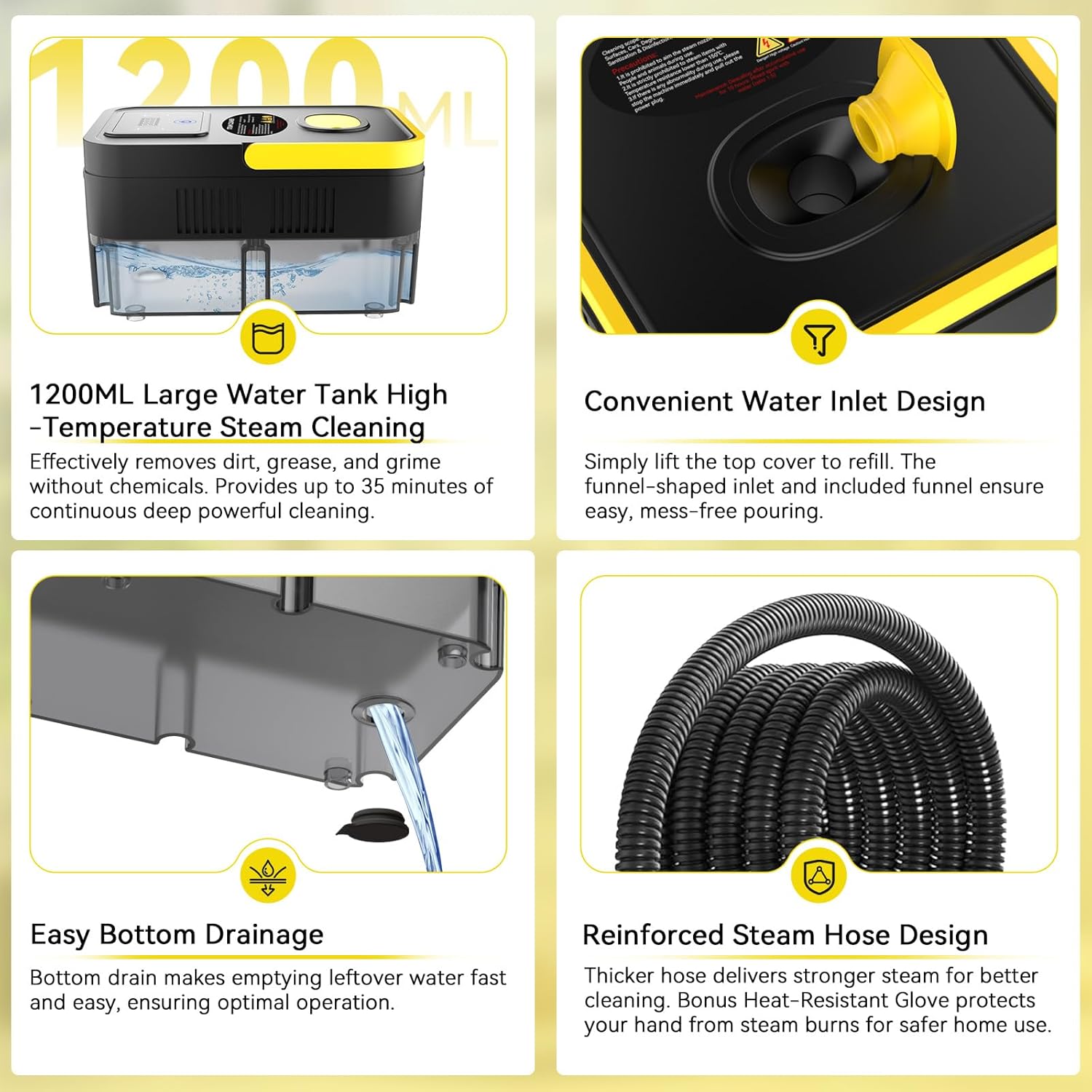 - 【Extended Reach & Portable Design】 Clean without limits using the 78.74/1.5m extended power cord and 86.61inch/2.2m steam hose. The portable body and multible accessory kits make it easy to tackle stairs, car interiors, windows, upholstery, and tight corners. Comes with a heat-proof, non-slip glove to keep your hands protected during tough jobs, and a collapsible silicone funnel for fast, mess-free refills. Built for serious cleaning, made for everyday use