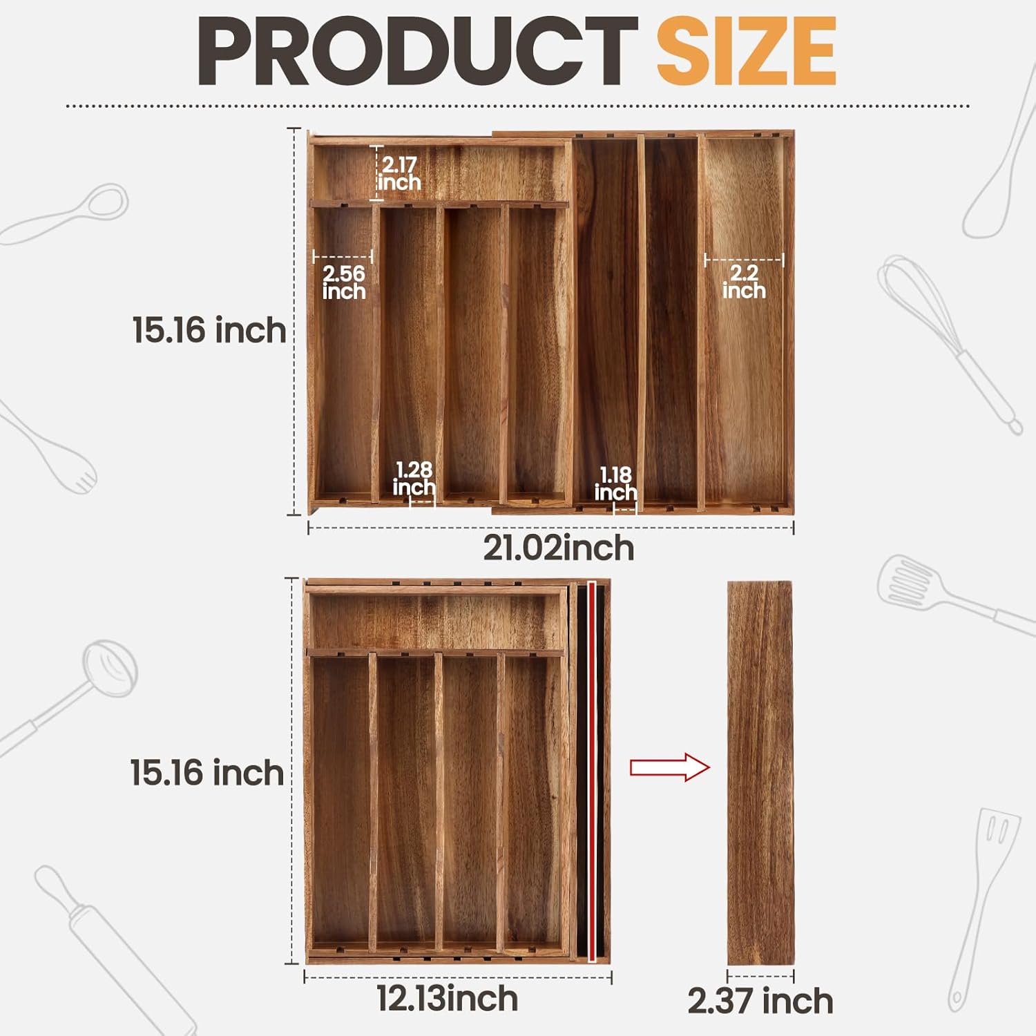 - Detachable Wooden Organization: Our silverware storage rack has 5 detachable wooden partitions. Easily rearrange or remove them to create the perfect compartment for your knives, forks, spoons, cooking tools, and even larger kitchen gadgets. Design a storage solution that perfectly fits your unique drawers and collections