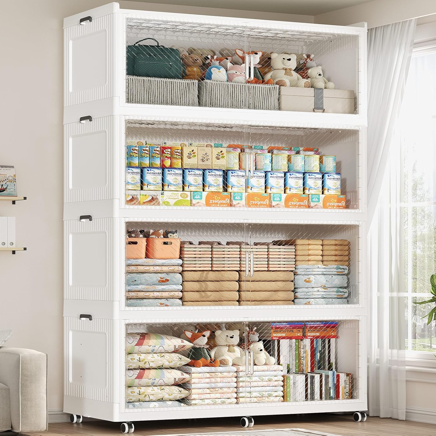 - 【Two Ways to Open & Magnetic Doors】The collapsible storage bins with lids and wheels feature a dual access way, allowing for both top and front door openings, and with clear brown windows for easy visibility. The super huge storage bins with open front doors are equipped with magnetic lock buckles to prevent dust from entering the cabinet.