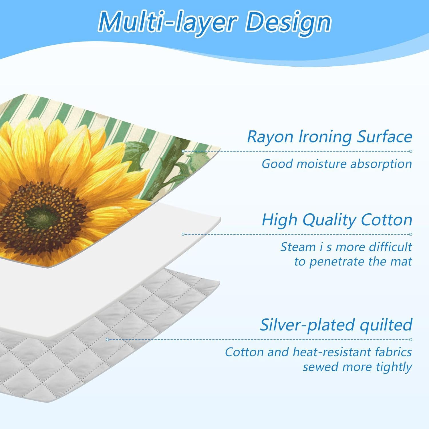 - High Quality:This ironing mat adopts a multi-layer design, with a surface made of Rayon lroning and good moisture absorption. High quality cotton in the middle makes it Steam more difficultto penetrate the mat. The bottom layer is coated with 210 silver-plated quilted, with cotton and heat-resistant fabricssewed more tightly. The ironing pad can be used on both sides, making it more durable
