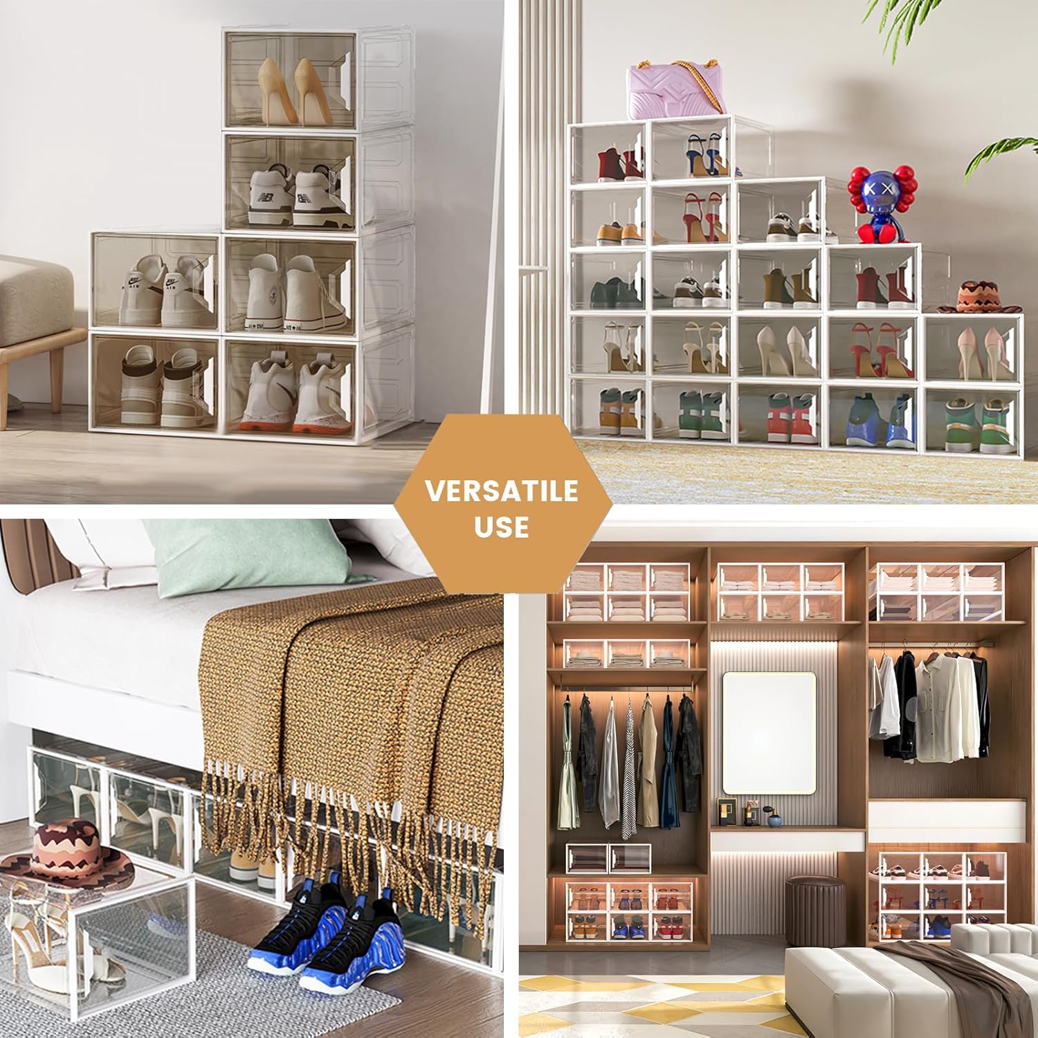 - 【Versatile Home Organization】: Beyond shoe storage, these stackable organizers store hats, collectibles, cosmetics, toys, and closet items, meeting diverse home organization needs. The transparent storage shoe containers bins replace traditional shoe racks, fitting seamlessly in entryways, closets, or under beds,creating a better environment for your cherished shoes or items.