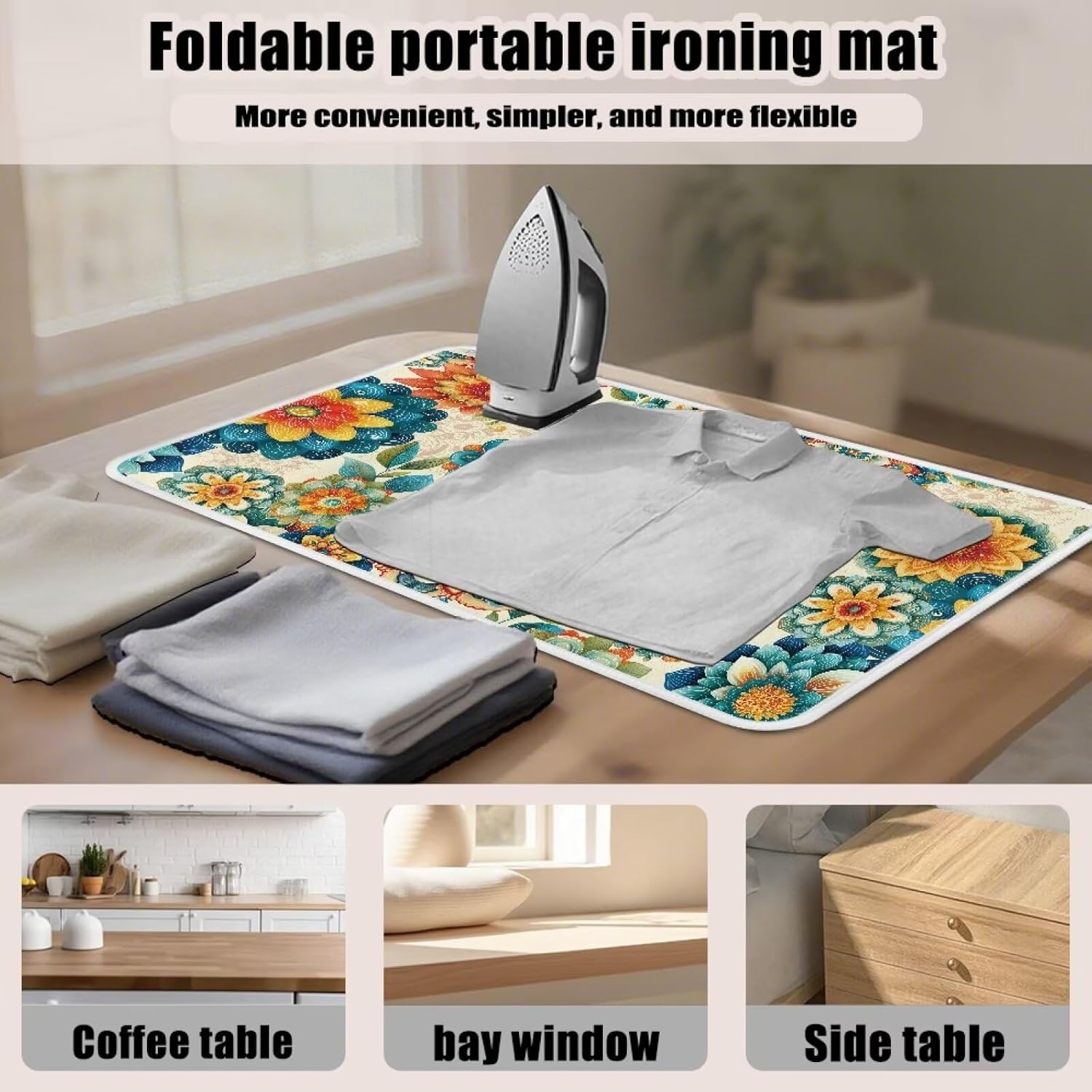 - 【Foldable】: Say goodbye to bulky ironing boards! This lightweight mat folds flat to the size of a magazine, making it ideal for studio apartments, dorm rooms, RVs, or tiny homes. Use it on any sturdy surface—kitchen tables, dressers, or even the bed—and store it in a closet, drawer, or under the bed when not in use