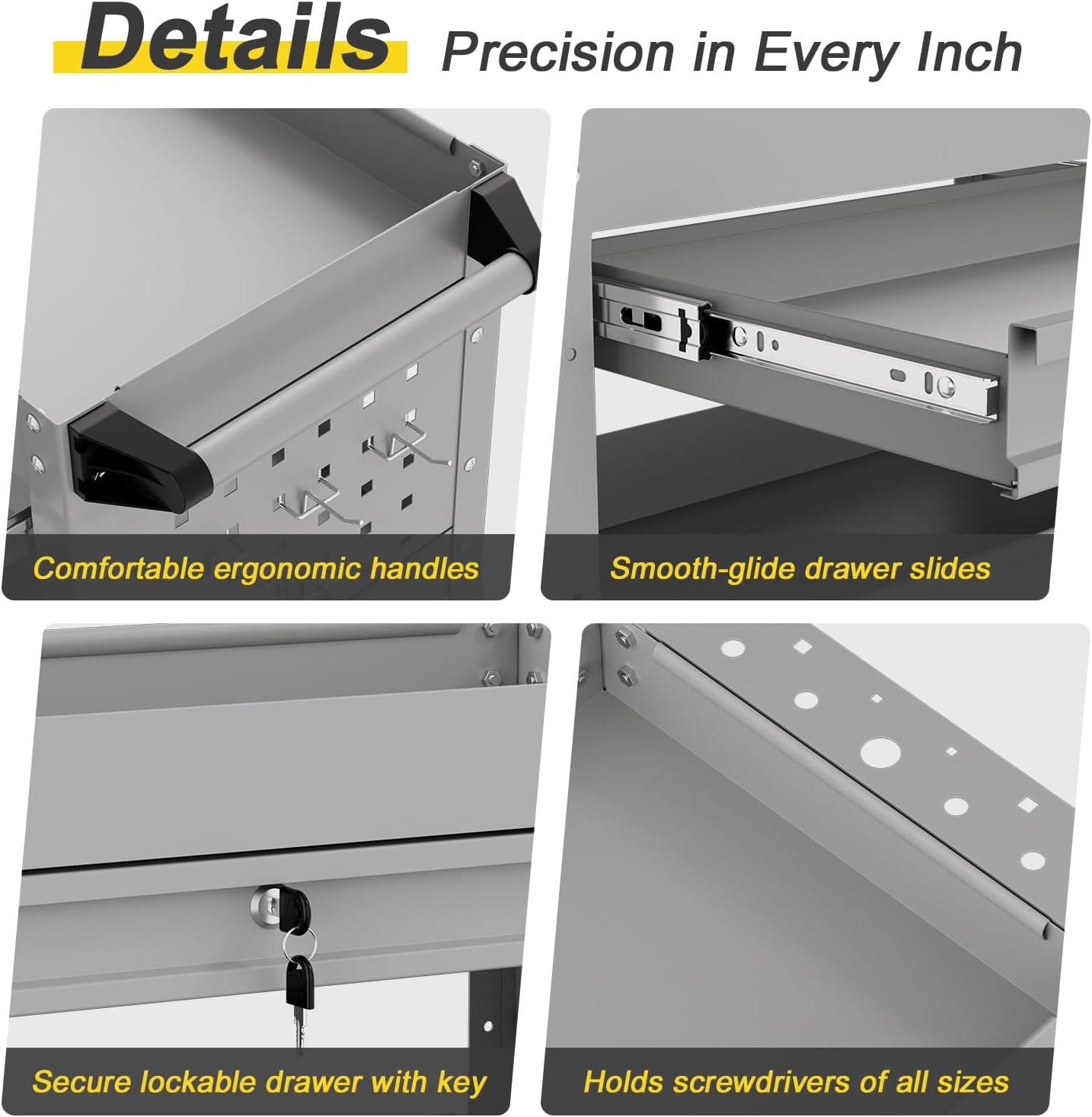 - Ample Tool Storage – This rolling tool cart with drawers features 3 trays, 1 lockable drawer, side hooks, and panels for tools and accessories. Ideal tool cart on wheels for shops and home use.