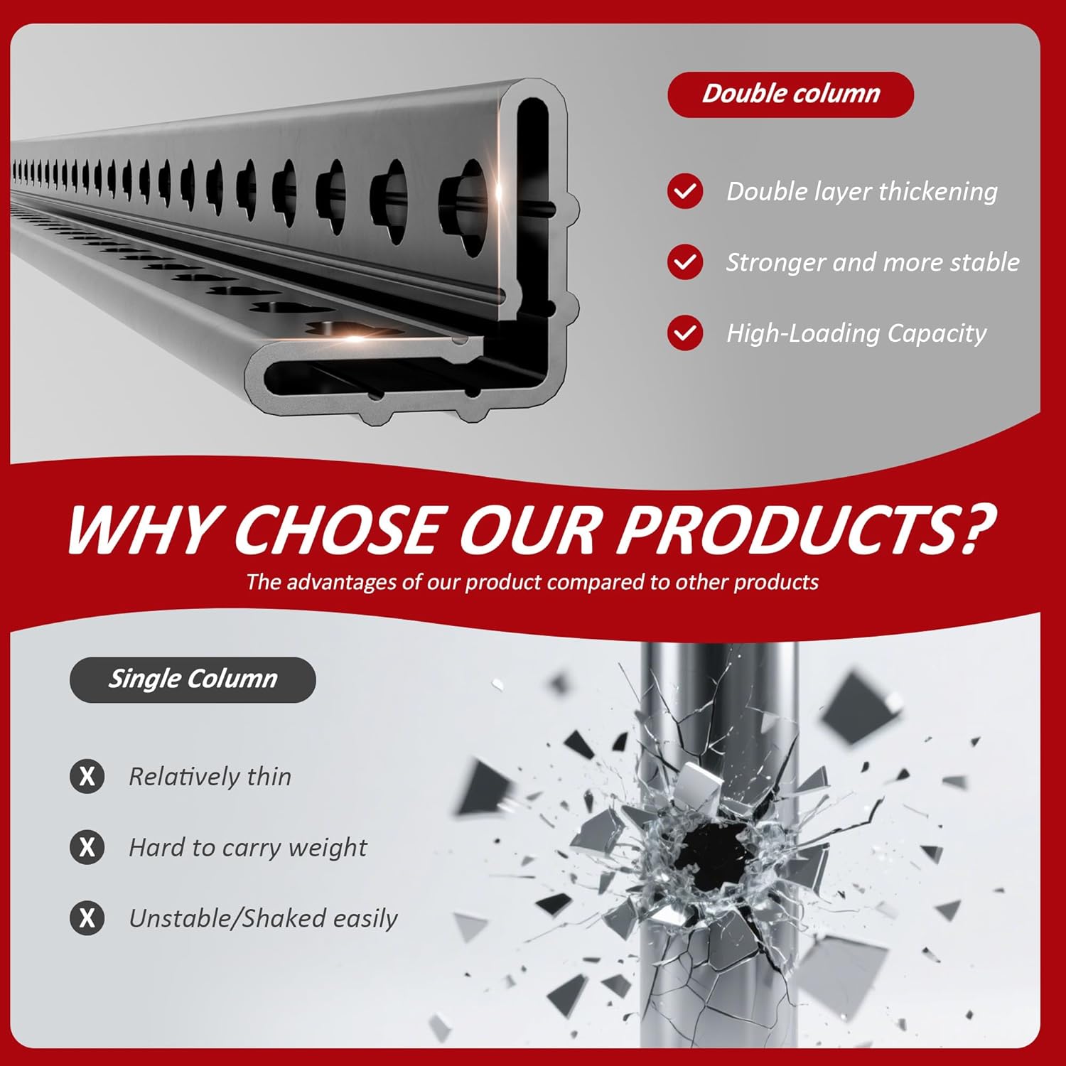 - Heavy Duty Garage Shelving Unit - This garage shelf is made of high-quality thickened cold-rolled steels and an anti-rust coating. The double-layer column design is stronger than the single-layer column, with a maximum load-bearing capacity of 3030LBS and a single-layer load-bearing capacity of 606LBS