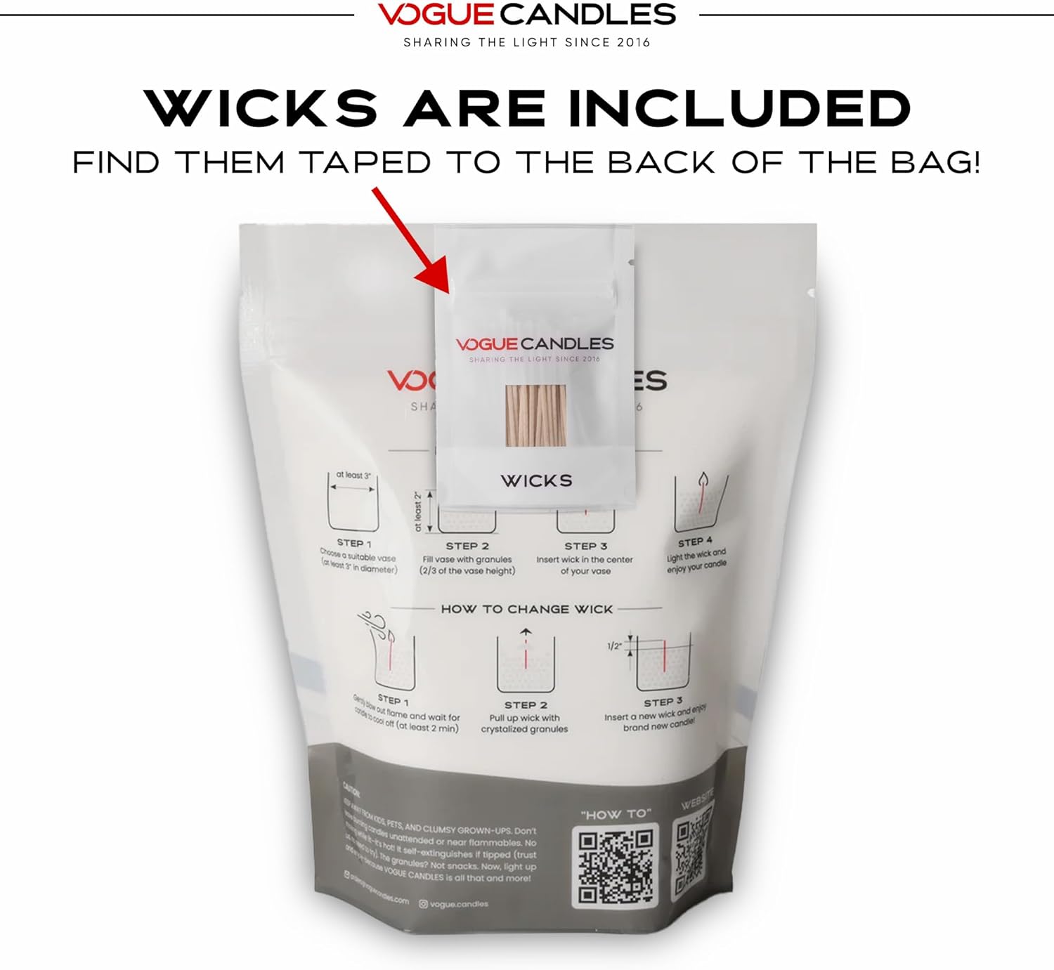 - Create a Candle, Your Way. No Mold, No Mess: Our signature plant based granules turn any vase or vessel into a stunning candle. Each 1LB kit includes 15 clean-burning cotton wicks. Each 5LB kit includes 50 wicks for extended use or gifting. Just pour to 2/3 full, insert a wick vertically, and light. No wax pouring or molds required. Every setup is unique, every candle is yours.