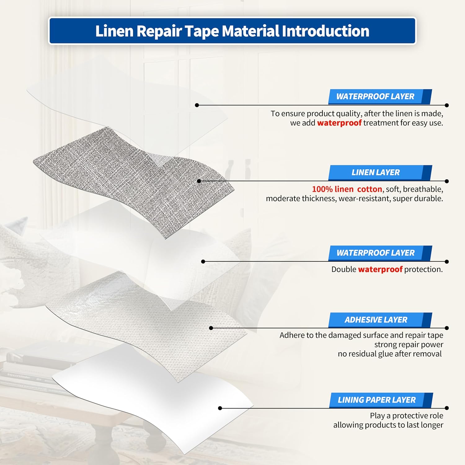 - Easy Application: Clean the damaged area, cut to the appropriate size, peel off the backing paper, and stick it to the damaged area. It only takes a few seconds to complete, and the repair effect is natural and tidy. Suitable for repairing linen products such as sofas, curtains, cushions, furniture, interior decorative fabrics, etc.