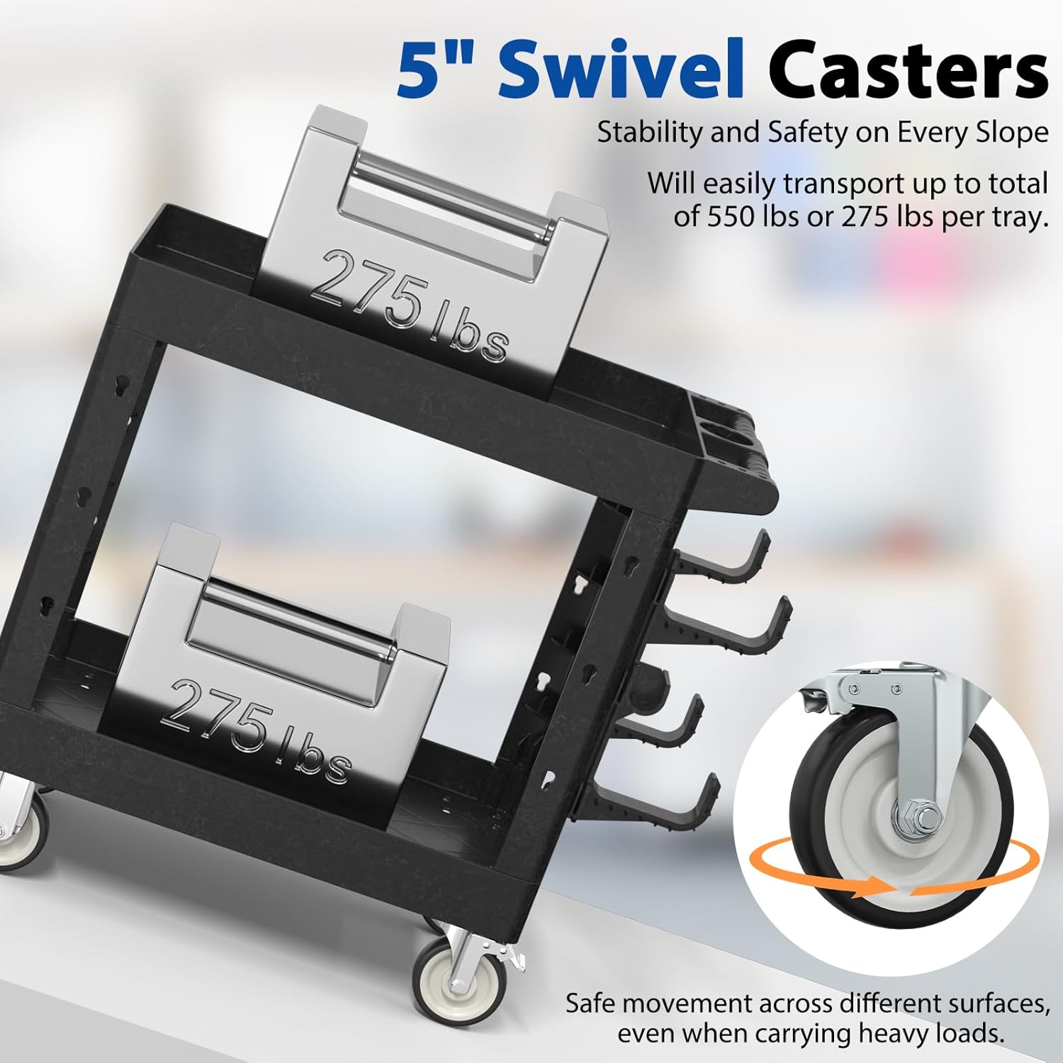 - 【Heavy-Duty Load Capacity】 Constructed from high-quality polypropylene (PP), this rolling utility cart is lightweight yet durable, resistant to scratches, rust, and dents, supporting up to 550 lbs (275 lbs per shelf). Perfect for use as a tool cart on wheels, work cart, or plastic utility cart for heavy-duty tasks.