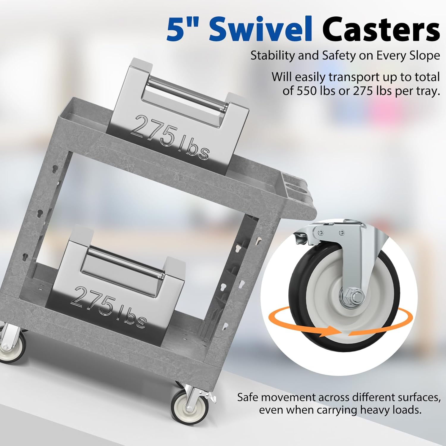 - 【Heavy-Duty Load Capacity】 Constructed from high-quality polypropylene (PP), this rolling utility cart is lightweight yet durable, resistant to scratches, rust, and dents, supporting up to 550 lbs (275 lbs per shelf). Perfect for use as a tool cart on wheels, work cart, or plastic utility cart for heavy-duty tasks.