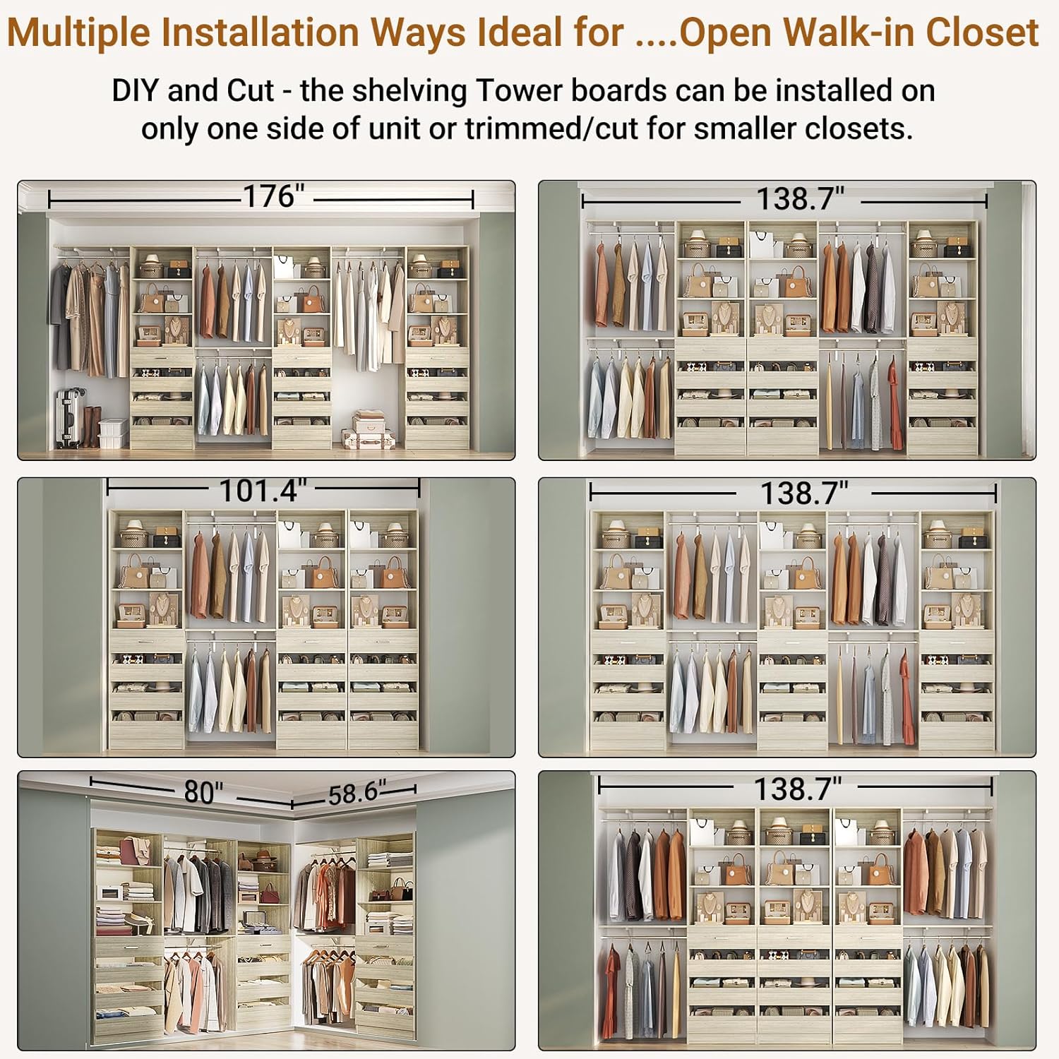- 【Customize and DIY Your Dream Walk-in Closet】With 4 expandable hanging rods, 4 top shelves and 3 closet towers, you can easily create a personalized closet system tailored to your space. Home organization system for walk-in closet spaces to store shirts, jackets, sweaters, pants, shoes, or other décor items. Multiple Installation Ways, Cut to fit more Wide Spaces.