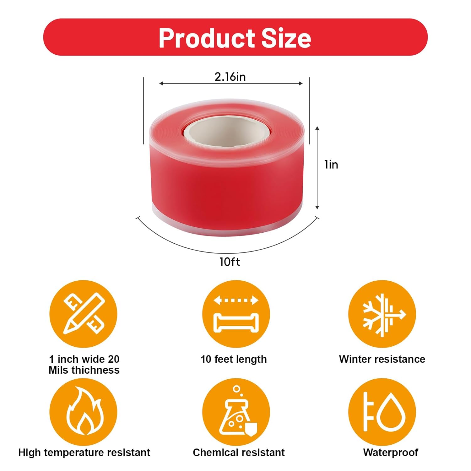 Self Fusing Silicone Tape 2 Rolls 1 in x 10' Red Waterproof Rescue Tape Rubber Leak Silicone Self-amalgamating Tape for Plumbing, Sealing Pipes, Hose Repair, Outdoor Coax and Tool Fixation