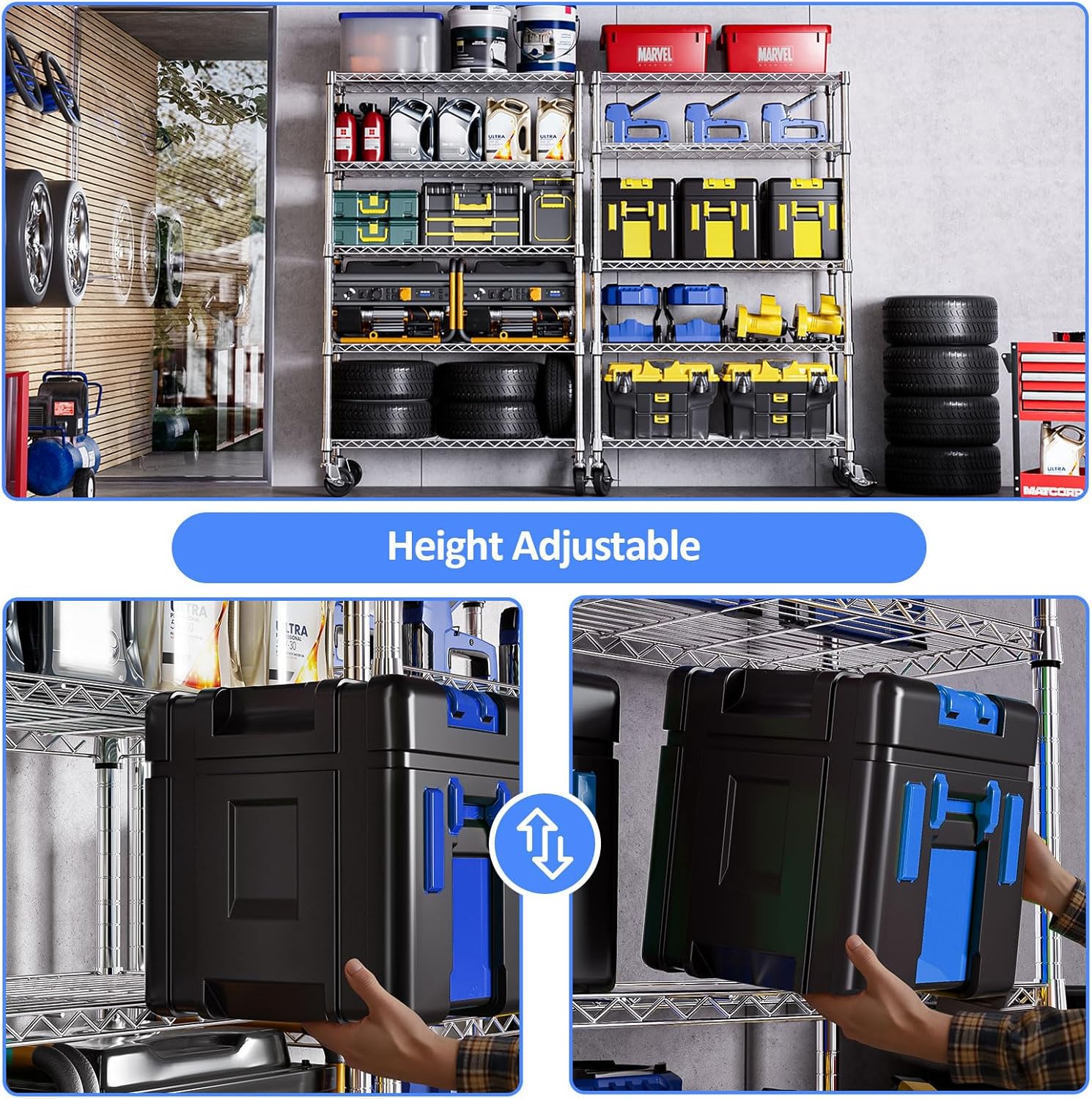 - 【Adjustable Shelves & 360° Lockable Wheels】Customize the height of each shelf in 1-inch increments to fit everything from large appliances to small bins. Equipped with 4 smooth-rolling 360° caster wheels (2 with locks), this unit offers maximum mobility and stability—effortlessly move it around your home, garage, or office, and lock it in place when needed.