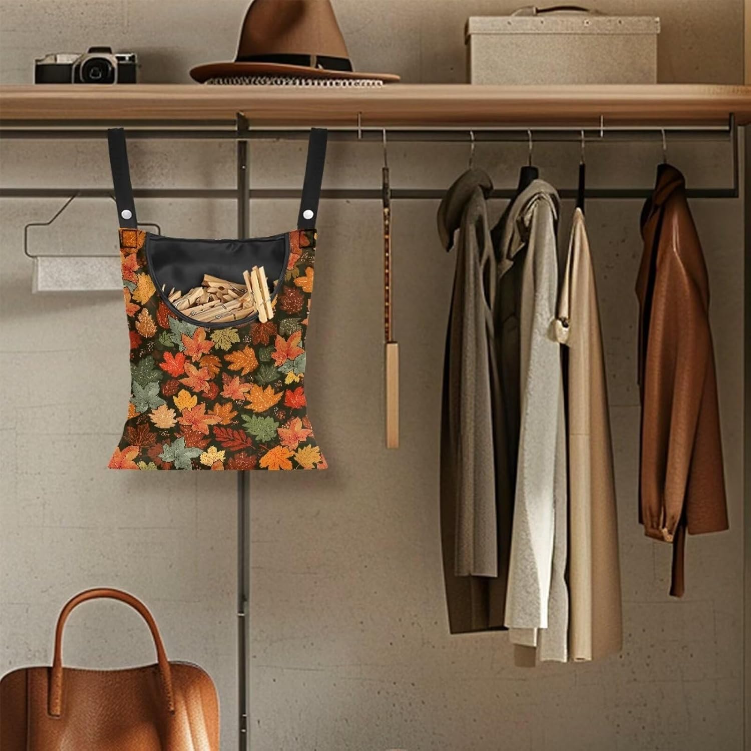 Fashion Maple Leaf Laundry Clothespin Holder Bag - 12x14.5 Inch Waterproof Hanging Organizer with Large Opening for Patio & Home