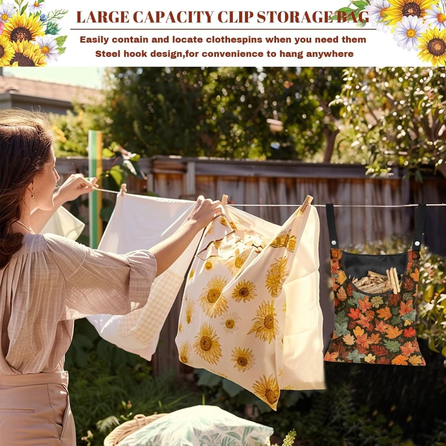 - 【With Hanger】these clothes pin bags outdoor waterproof with Equipped with sturdy rust-proof steel hooks can rotate 360 degrees, so you can hang it in different places according to need, such as bedroom, kitchen, living room, balcony, porch, yard, and other indoor and outdoor places, space saving and convenient.