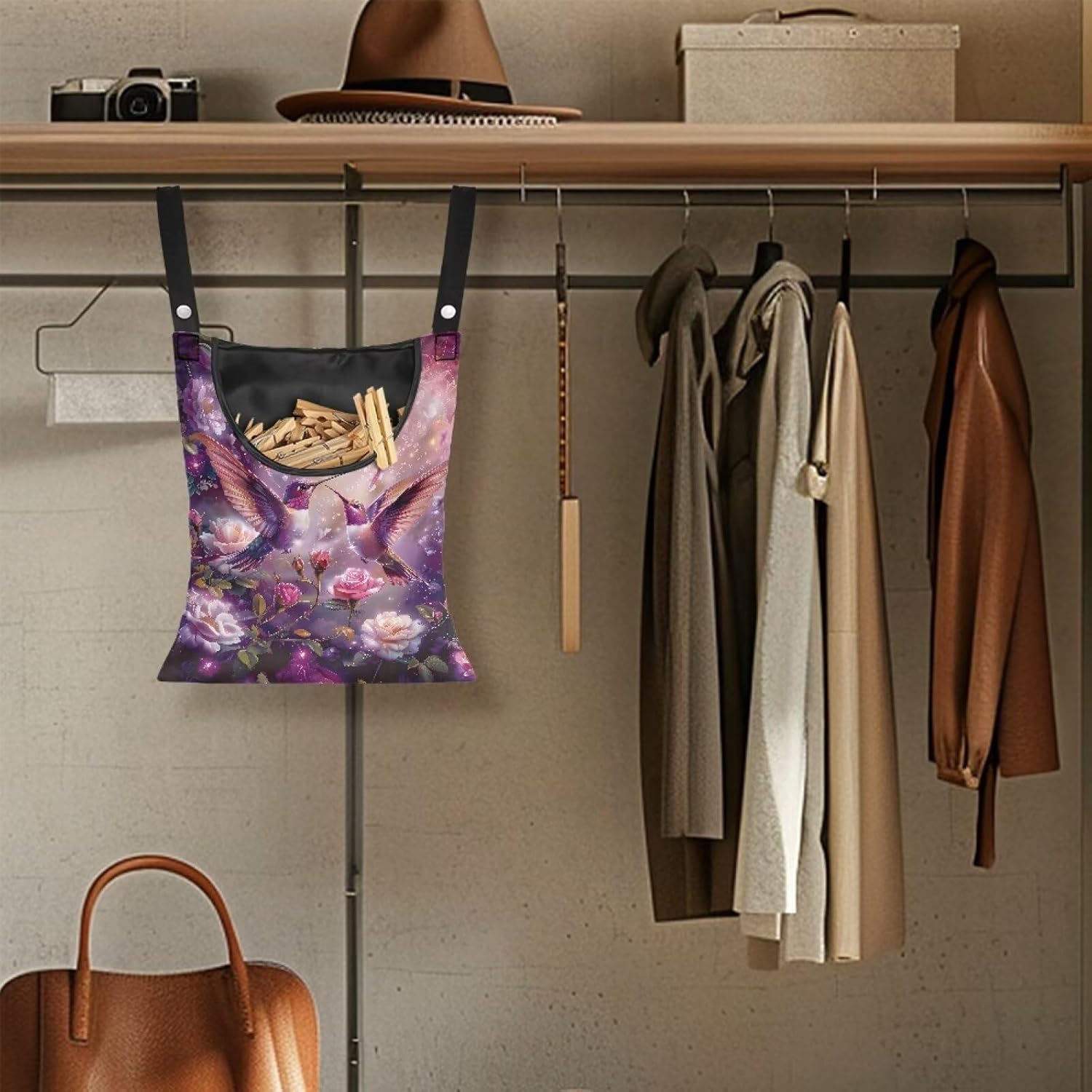 Purple Flower Hummingbird Clothespin Bag with Hanging Hook Summer Laundry Clothes Pin Holder Waterproof Clothes Pin Hanging Bag Clothespin Storage Organizer for Indoor and Outdoor