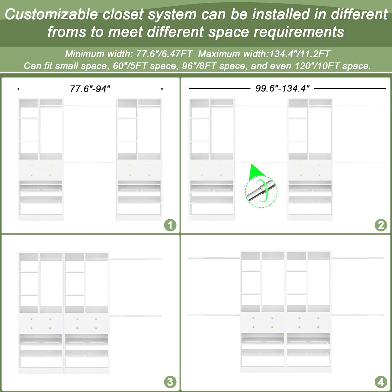 Closet System, Up to 134"/11.2 FT Closet Organizer with 4 Wooden Drawers and Shelves, Walk-in Closet System with 6 Hanging Rods, Built-in Closet Can Fit 96"/8FT, 120"/10FT, White