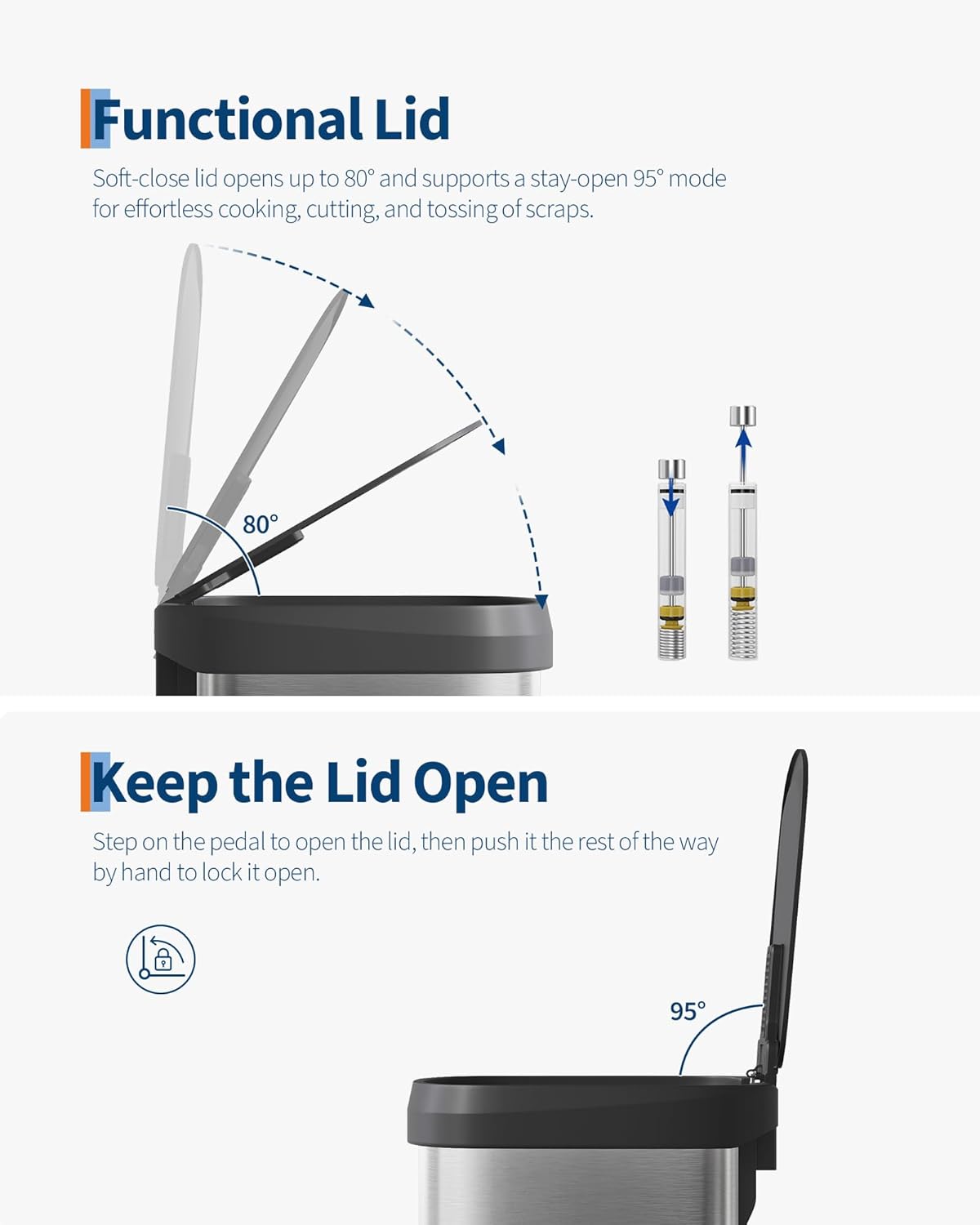 - Extended Height and Capacity: This trash can extends to 35.63 inches at full lid opening, perfectly fitting under a standard 36-inch island countertop. Its bucketless interior can hold up to 55 large water bottles or 110 cans, maximizing storage without taking up extra floor space.