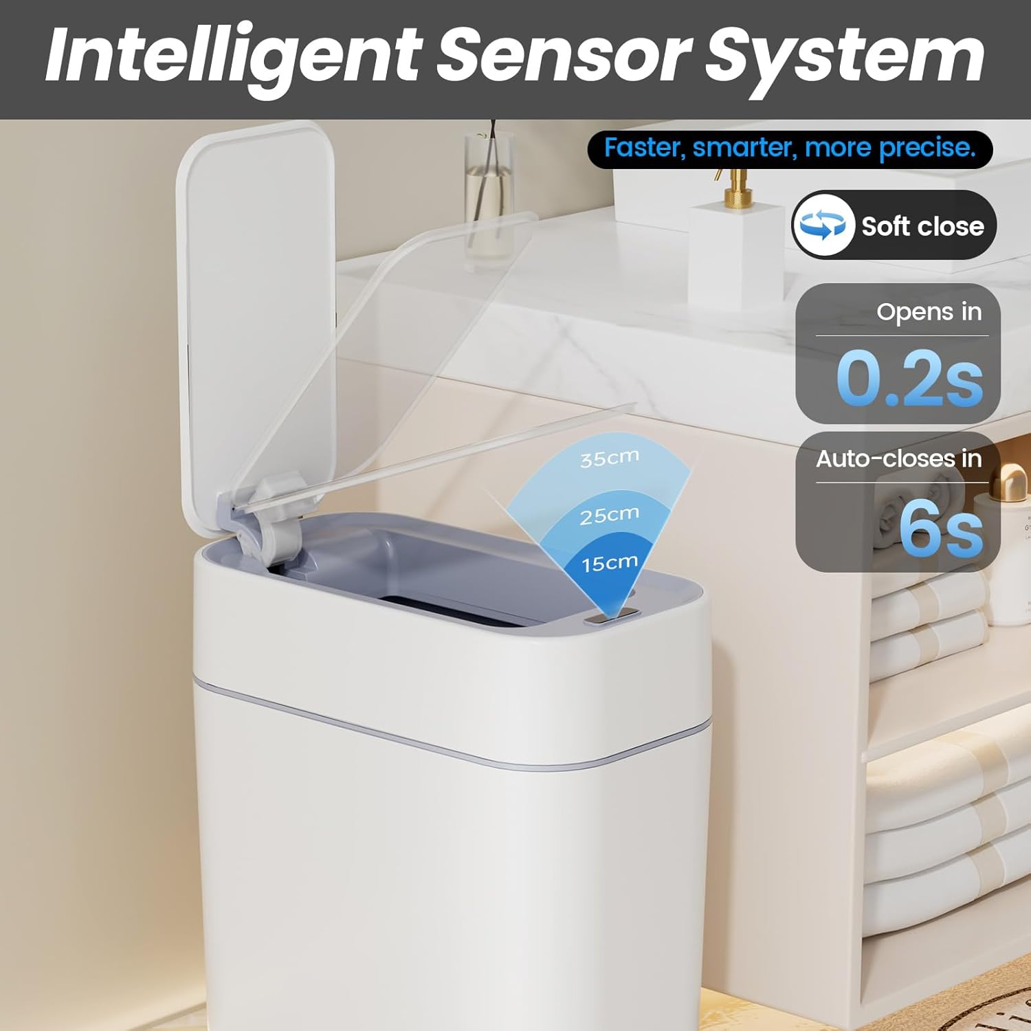 - Hygienic Touch-Free: This touchless bathroom trash can features an advanced motion sensor trash can system that opens the lid with a simple hand wave and auto-closes after 5 seconds. No pedals or touching needed. Ideal for bathroom garbage can use and those with limited mobility — it keeps your space cleaner and more sanitary.